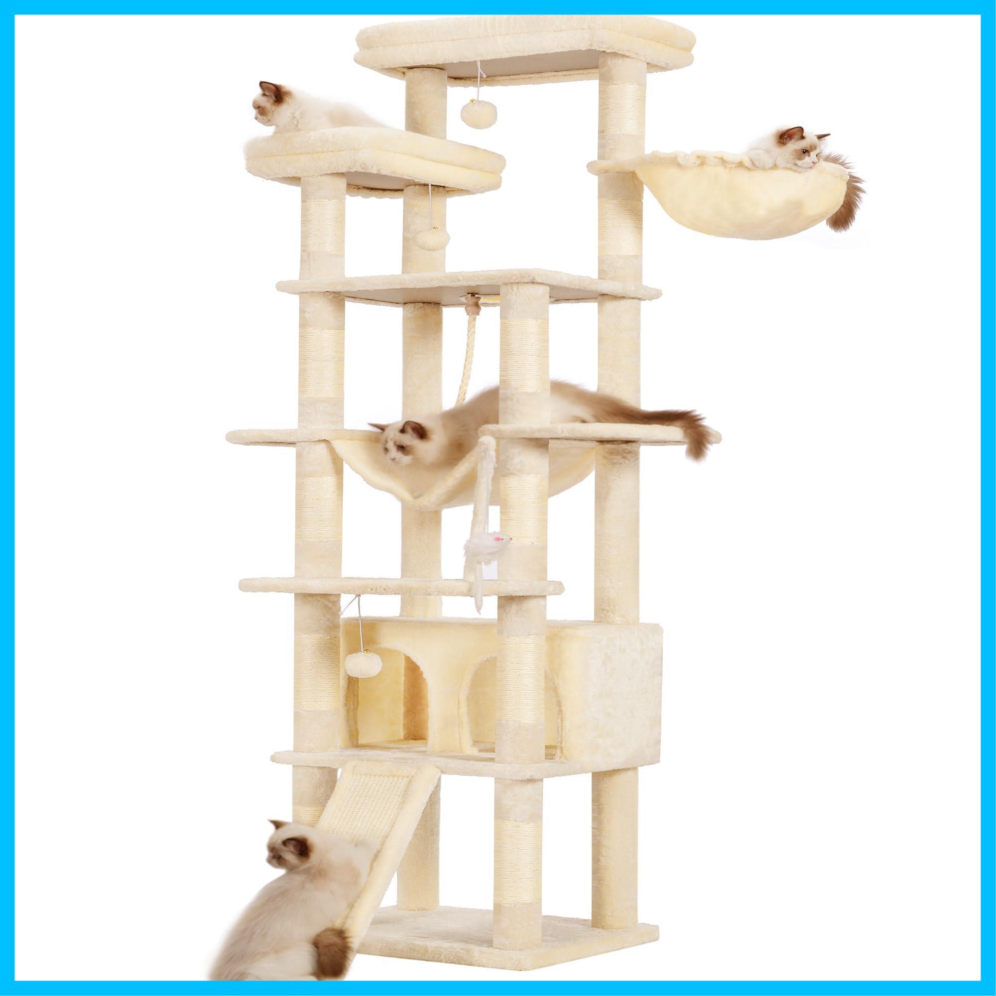 Heybly キャットタワー 大きな猫や多頭飼い 超スリム 据え置き型 省スペース 登りやすい ハンモック2つ 大きな見晴らし台 天然麻紐 爪研ぎ棒 給餌台 高さ200cm ベージュ HCT033M | Lulu