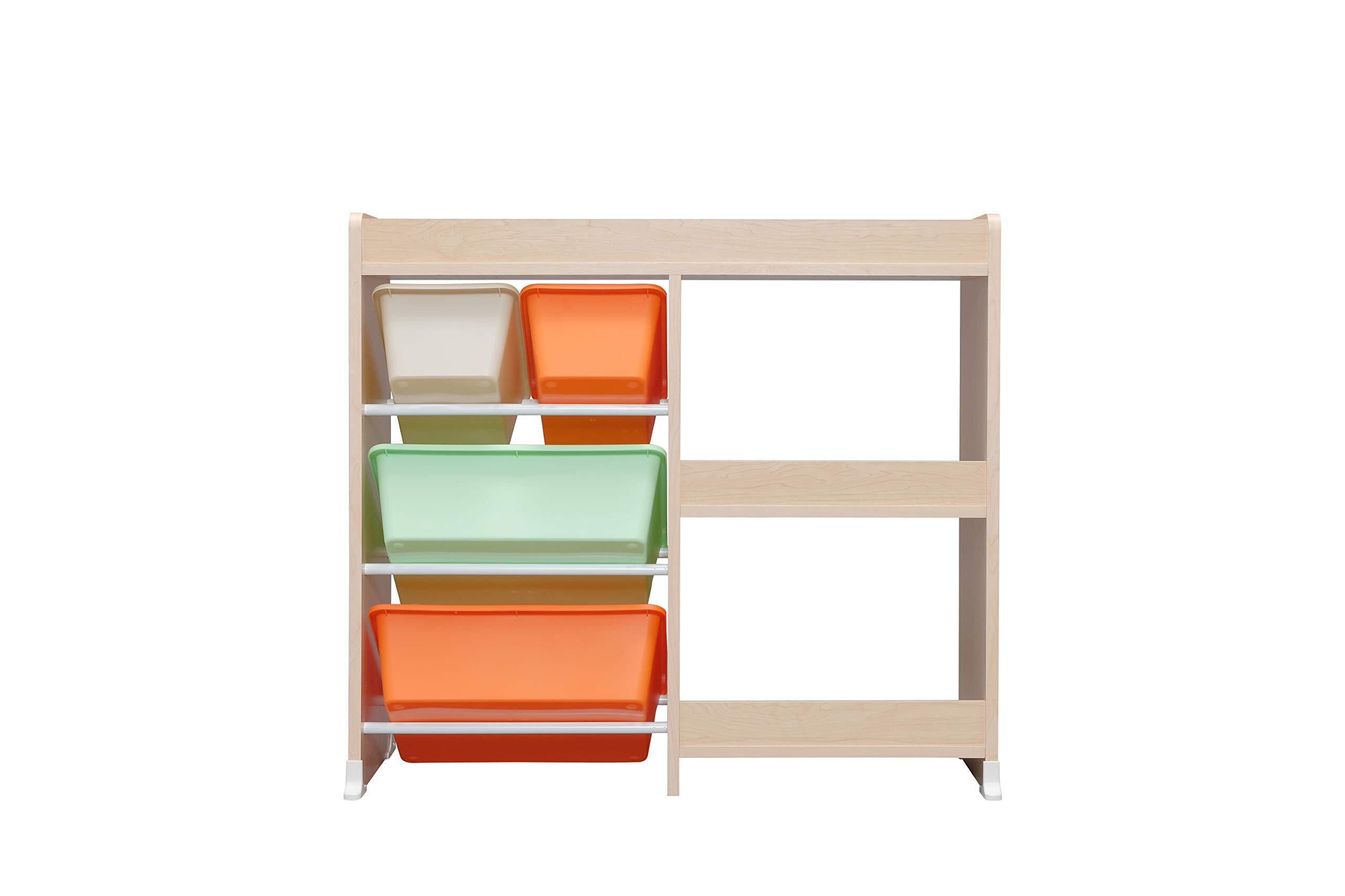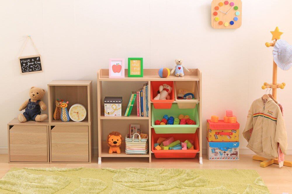 色やサイズで、しまうものの種類分けができる知育家具です。