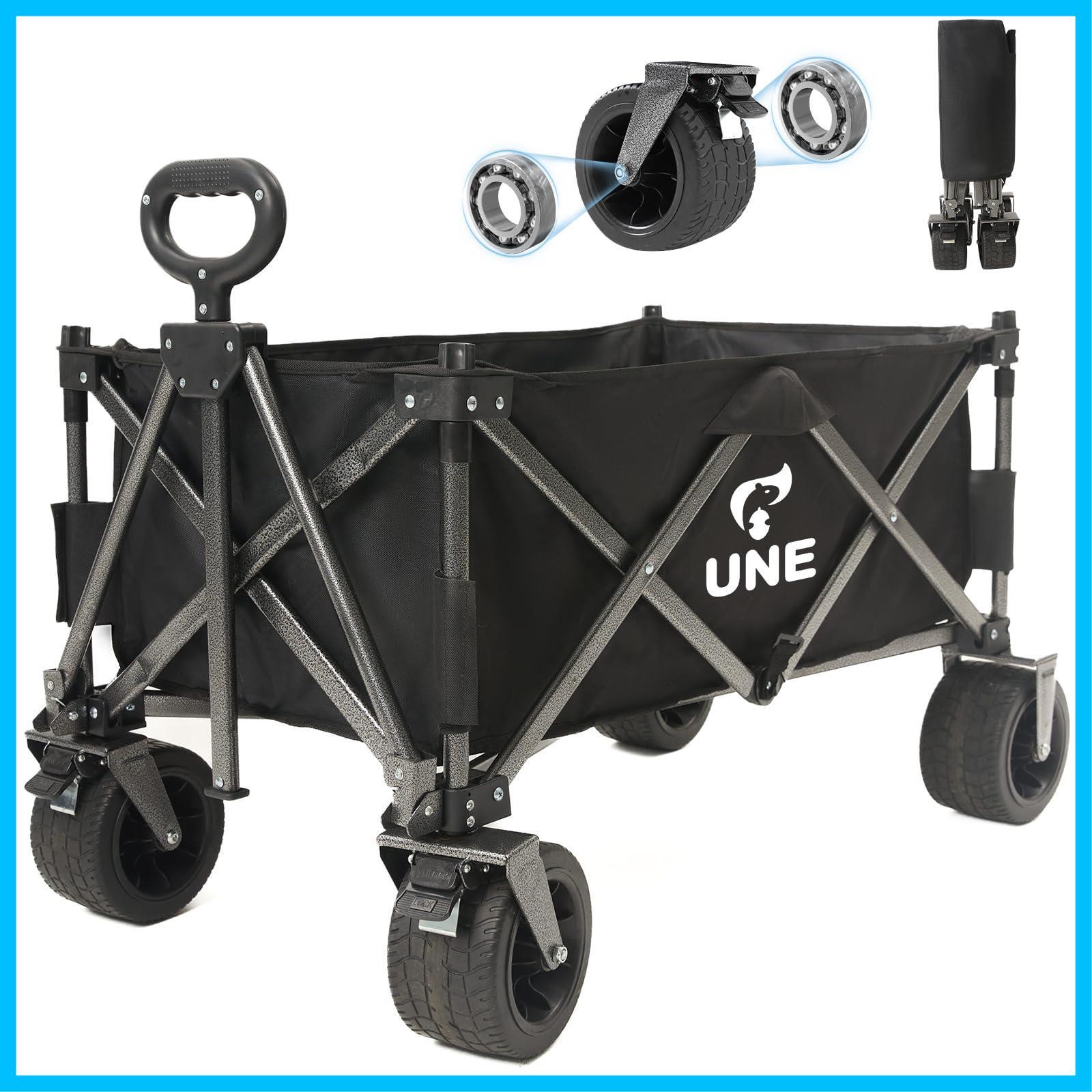 UNE キャリーワゴン アウトドアワゴン 折り畳み式 キャンプ カート ブレーキ付き 大容量 150L ワンタッチ収束式 耐荷重150kg 自立収納 コンパクト 幅10cmのサイレントユニバーサルホイール付き 調節可能なハンドル 釣り キャンプ 庭 スポーツ ピクニック ショッピング用