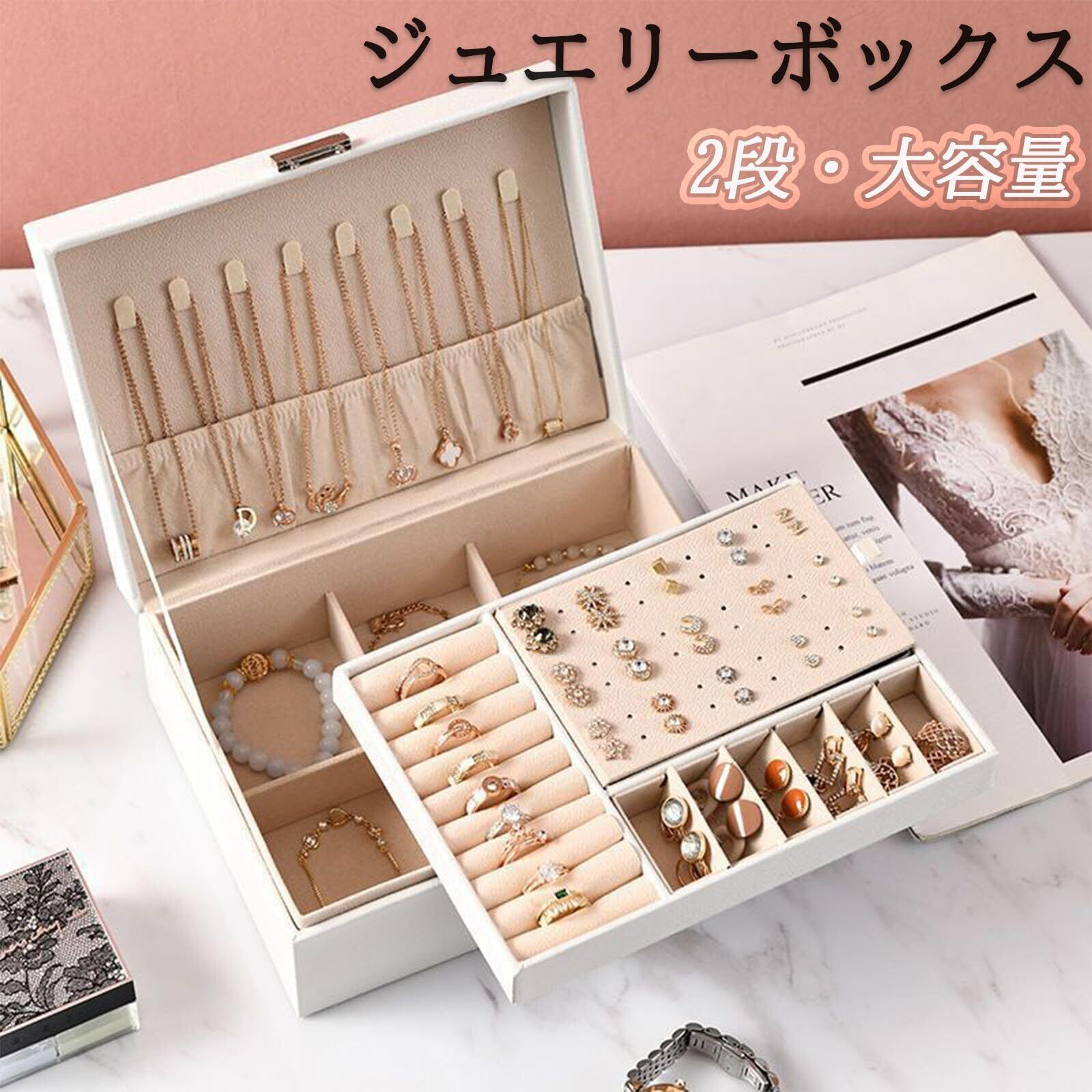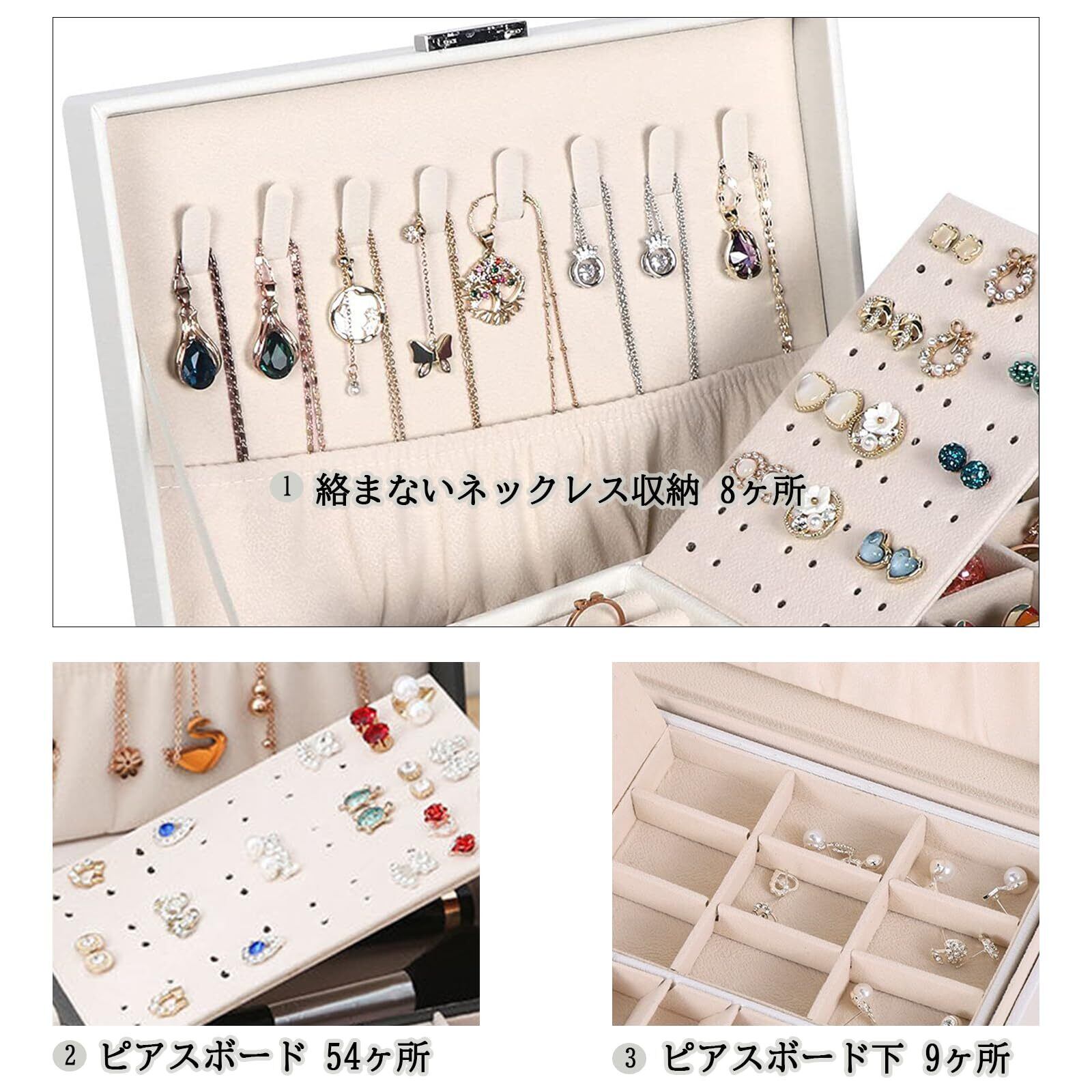 【大容量】2段式なのでたくさん入ります。絡まないネックレス収納 8ヶ所、ピアスボード 54ヶ所、ピアスボード下 9ヶ所、指輪・イヤリング 20ヶ所、2段式の下スペース 6ヶ所収納できる大容量タイプです。チョーカー、アンクレット、ブレスレット、バングル、リストバンド、ブローチ、コサージュ、チャーム、ヘアアクセサリーなども保管に。アクセサリーを100個以上収納できるジュエリーボックスです。