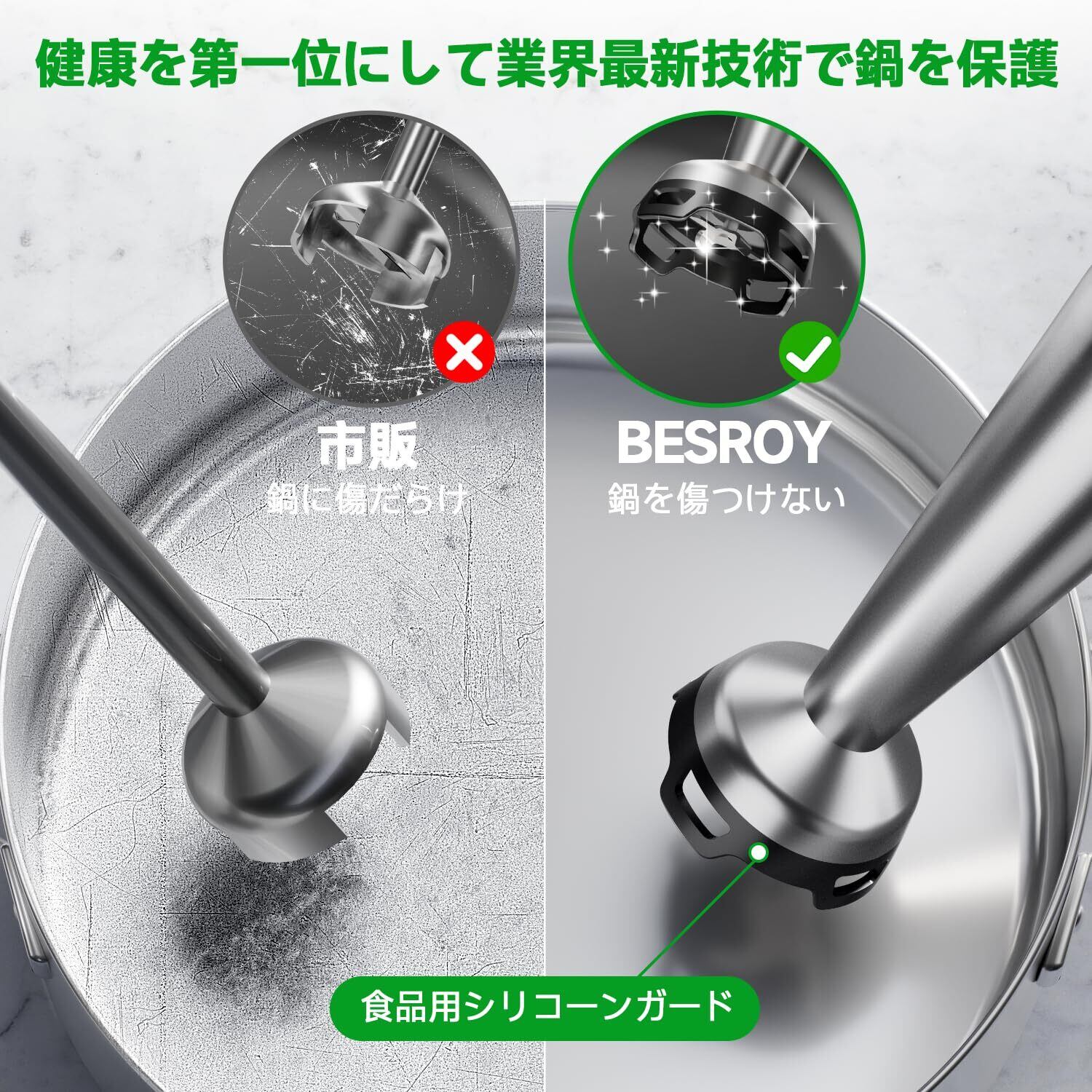 ✨【安全な使用感を備えた逸品】耐久性と安全性を確保するため、BESROY ハンドブレンダー本体には過熱保護機能と超負荷保護機能が付きます。連続長い時間に使用した場合は本体モーターを守るため、自動的に運転を止まり、その時は本体モーターに冷却時間を渡したら、もう一度使用できます。また、コーヒー豆、冷凍食材、穀物、氷砂糖などの固い食材を避けてください。氷を砕くの場合には家庭用の氷で使用して、肉や魚の骨、皮、筋は取り除く、冷凍食材は半解凍などをお願い致します。