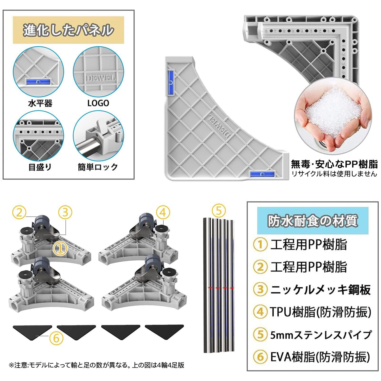 ️【耐加重500kg・減音防振】:①2連の車輪4個付き:重い家電を360°滑らかに移動できます。力の弱い女性でも洗濯機を簡単に動かせ、掃除がラクラク!②巨大なジャッキ4本増加:安定性アップ!耐荷重も500kgまで達します。より多くの家電製品が対応できます! ③防振EVAパッド付き:脱水時の振動や異音を吸収し、静音性アップ!