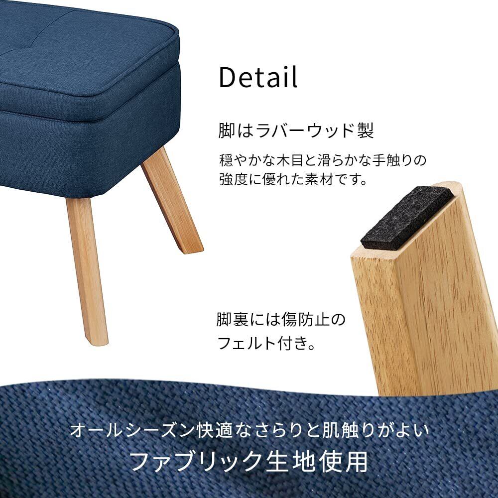 脚は穏やかな木目と滑らかな手触りが特徴のラバーウッド。 強度に優れた素材です。 足裏にはキズ防止のフェルト付き。 生地はオールシーズンOKのさらりと肌触りがよいファブリック生地使用。