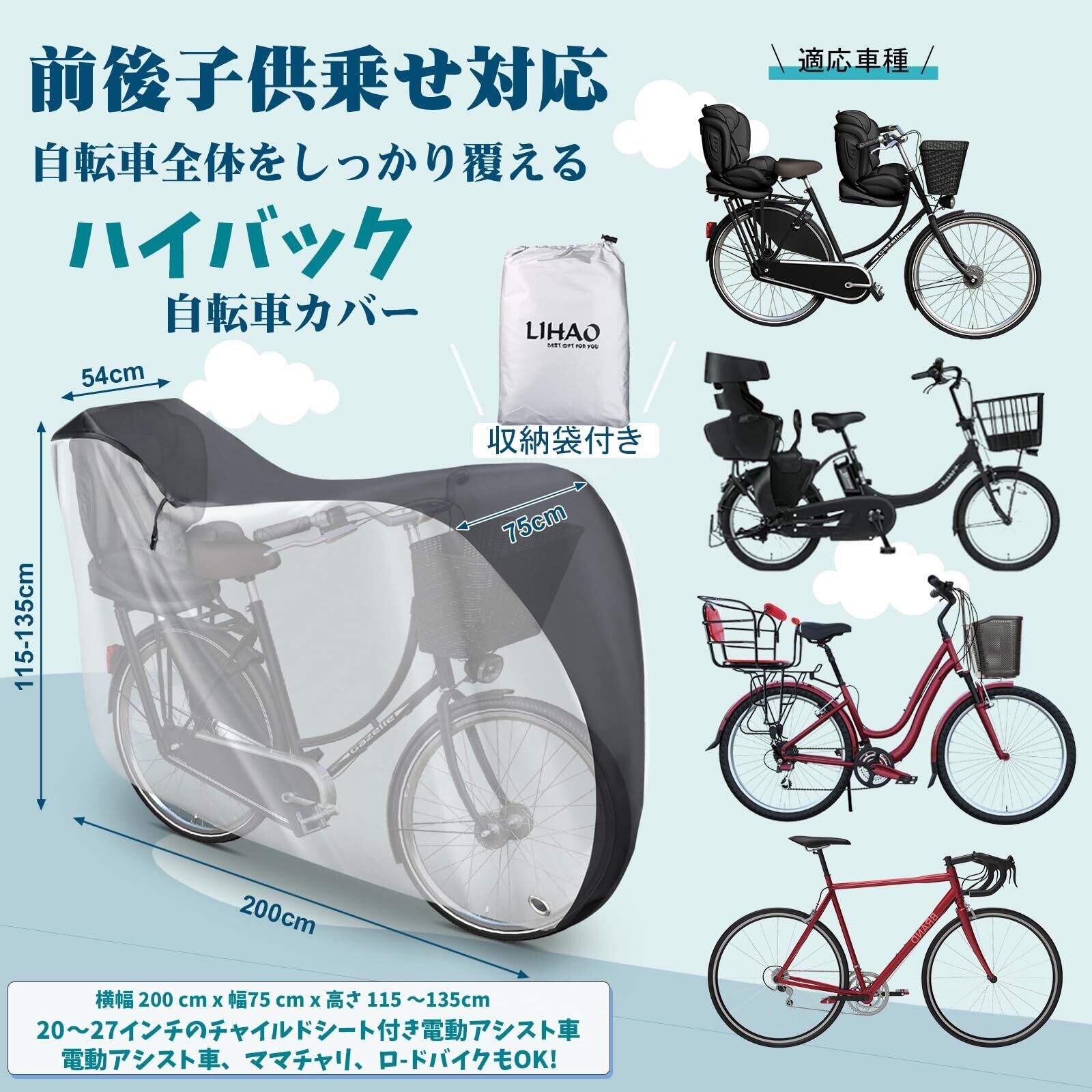 LIHAO 自転車カバー 子供乗せ ハイバック 前 後ろ後ろ 対応 防水 大型 防水 電動自転車カバー 子供乗せ 後ろ 撥水加工 雨避け 風飛び防止 UV加工 盗難防止 装着簡単 収納袋付き