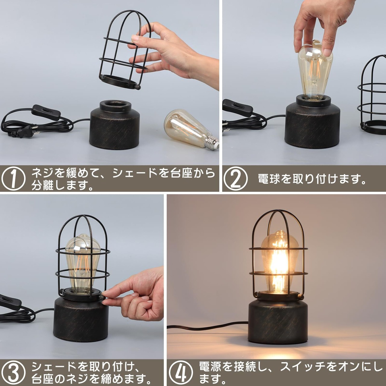 【商品仕様】商品サイズ:22*10.4*10.4cm 商品内径:9cm 重量:0.4kg 電源コード:145cm 材質:鉄 規格電圧:100V 口金:E26 電球仕様:LEDフィラメント電球 定格電圧:AC100V 口金:E26 消費電力:4W(40W形相当) 全光束:450lm 色温度:電球色 2700k 発光角度:360° 調光:非対応