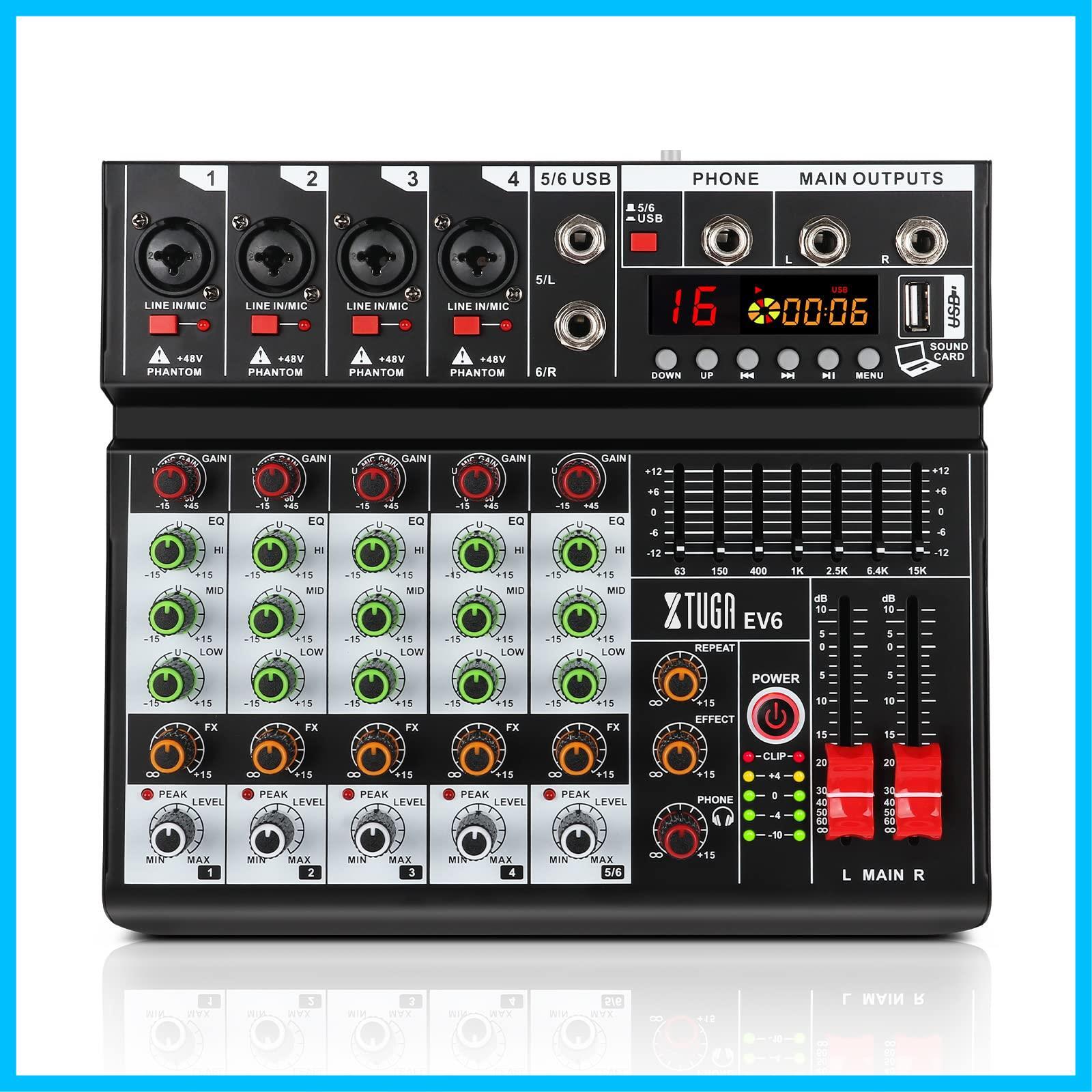 XTUGA EV6 プロフェッショナル6チャンネルオーディオミキサー16DSPエフェクト、7バンドEQ、独立48Vファンタム電源Bluetooth機能、USBインターフェース録音スタジオ/DJステージ/パーティ/ホームレコーディング用