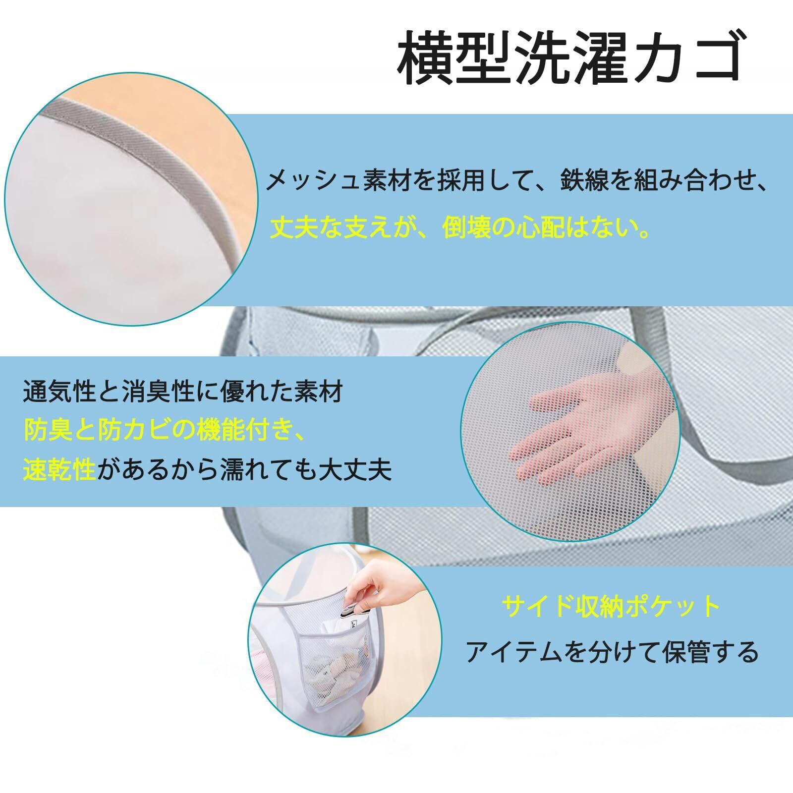 AYO 洗濯カゴ 洗濯かご 洗濯籠 ランドリーバスケット ランドリーバッグ ランドリーボックス 洗濯物入れ 脱衣かご 袋 かご 折りたたみ メッシュ 持ち運び可能 大容量 70L 超軽量 省スペース 収納 自立 ハンドル付き 横型 グレー | Lulu