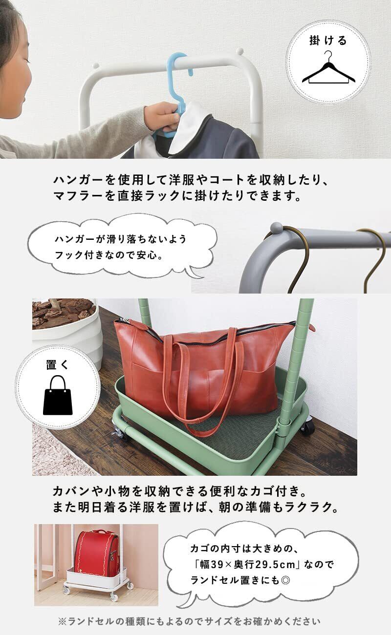 高さが変えられるバスケット付きハンガーラック。落ち着きのあるくすみカラーを採用。