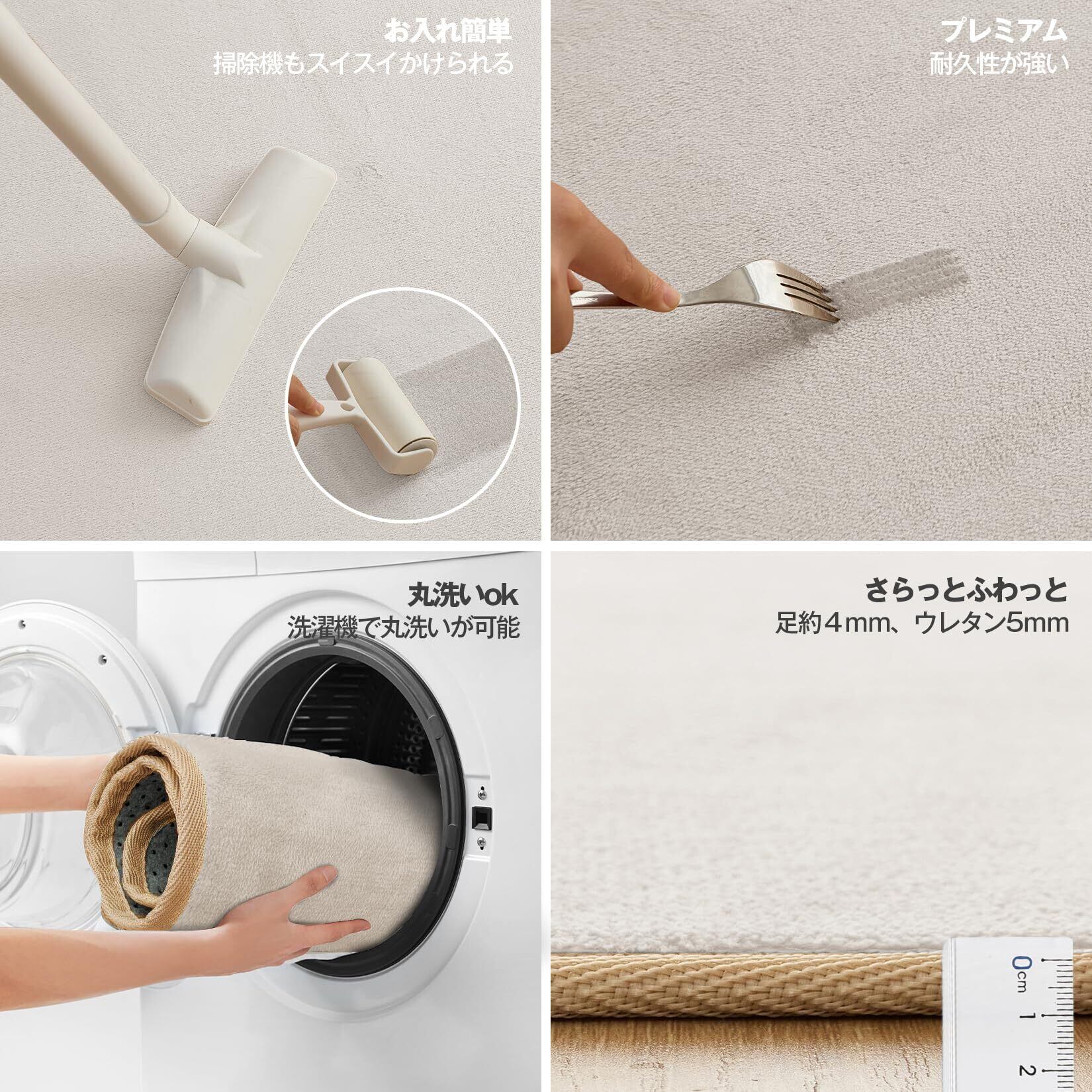 【家事がラク!】毛足4mmのショート設計で掃除も快適、毛糸にゴミが絡まらず、毛足が短く掃除がしやすい!ゴミが絡みにくく、掃除機やテープ(コロコロ)でもスイスイお掃除が可能です。遊び毛が少ないためホコリも出にくく、清潔にお使いいただけます。また、汚れてもご家庭で丸洗いができます。