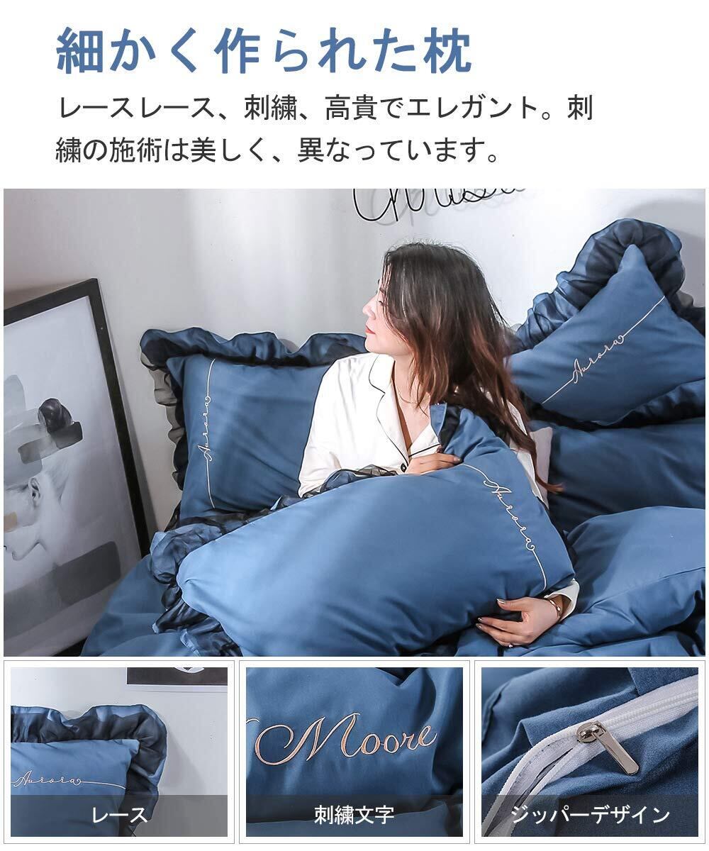 布団カバー シーツ 刺繍 蓮の葉 寝具カバーセット 掛け布団カバー ボックスシーツ 枕カバー ベッド用 布団用 洗い替え速乾タイプ(ブルー A4, セミダブル・4点セット)
