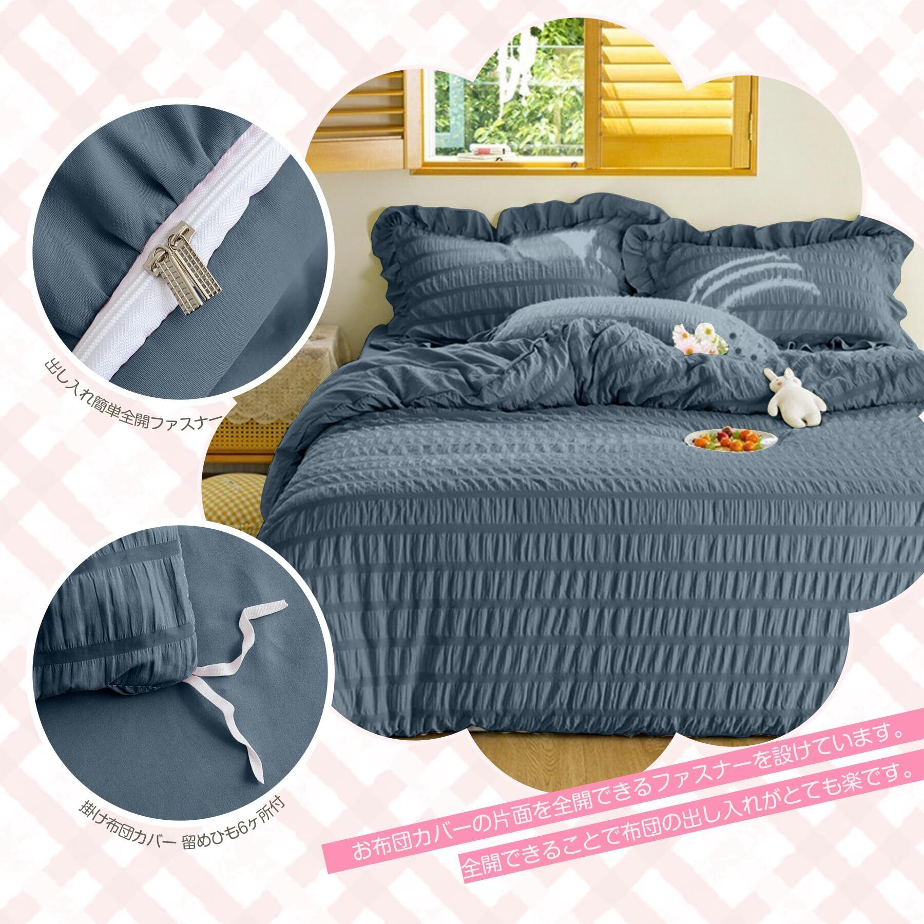 【シアサッカー生地 大人かわいい上品な フリル】 ポリエステル100%、綿素材と比べてシワになりにくく、シアサッカー生地で、肌触りが良く、快適で心地よくご利用いただけます。波のような縞ができていて柔らかな肌触りで1年中でご愛用いただけます。おしゃれで甘すぎない程よいフリル感に仕上げました。いつもの寝具にセットするだけで、お部屋を華やかに演出します。