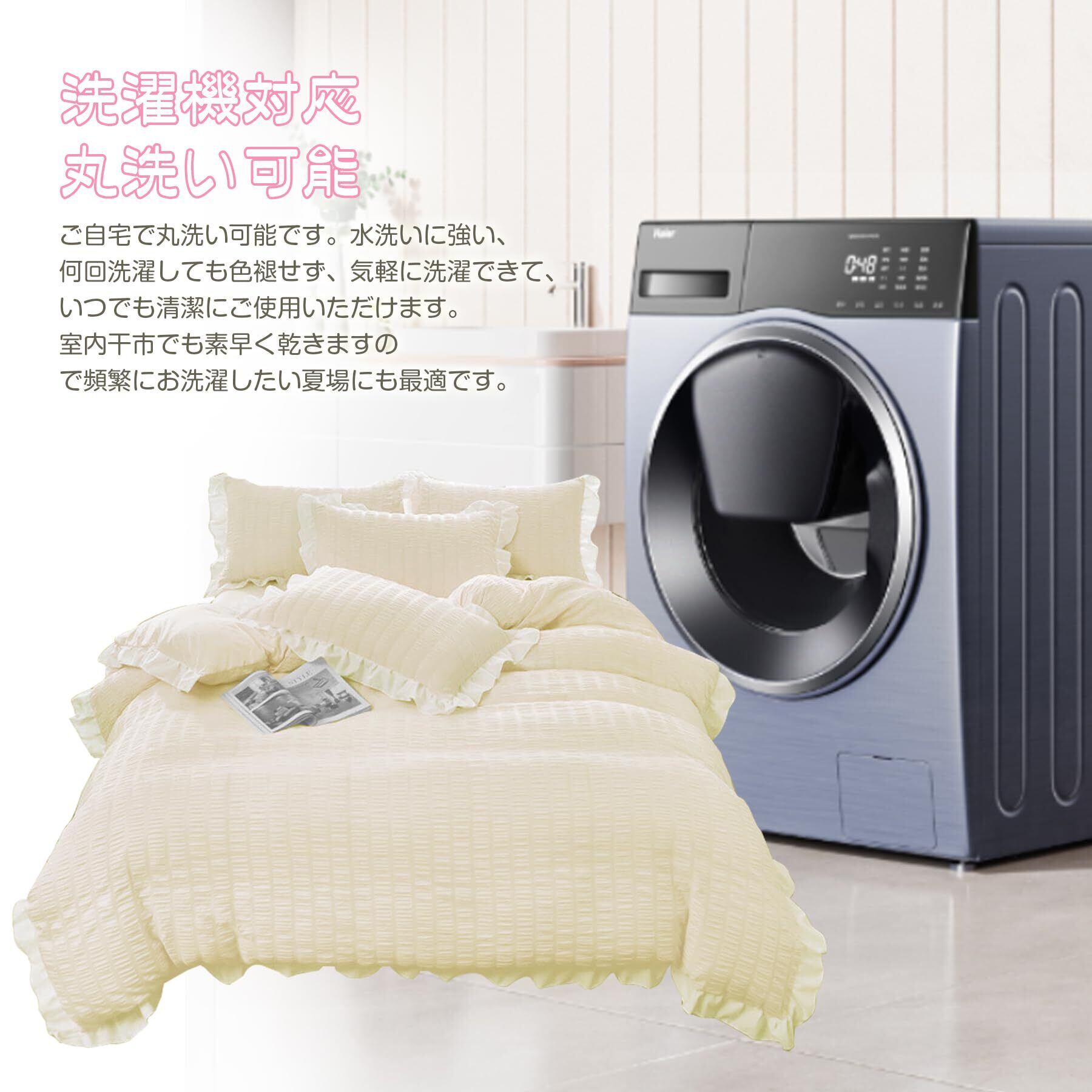 【シアサッカー生地 大人かわいい上品な フリル】 ポリエステル100%、綿素材と比べてシワになりにくく、シアサッカー生地で、肌触りが良く、快適で心地よくご利用いただけます。波のような縞ができていて柔らかな肌触りで1年中でご愛用いただけます。おしゃれで甘すぎない程よいフリル感に仕上げました。いつもの寝具にセットするだけで、お部屋を華やかに演出します。