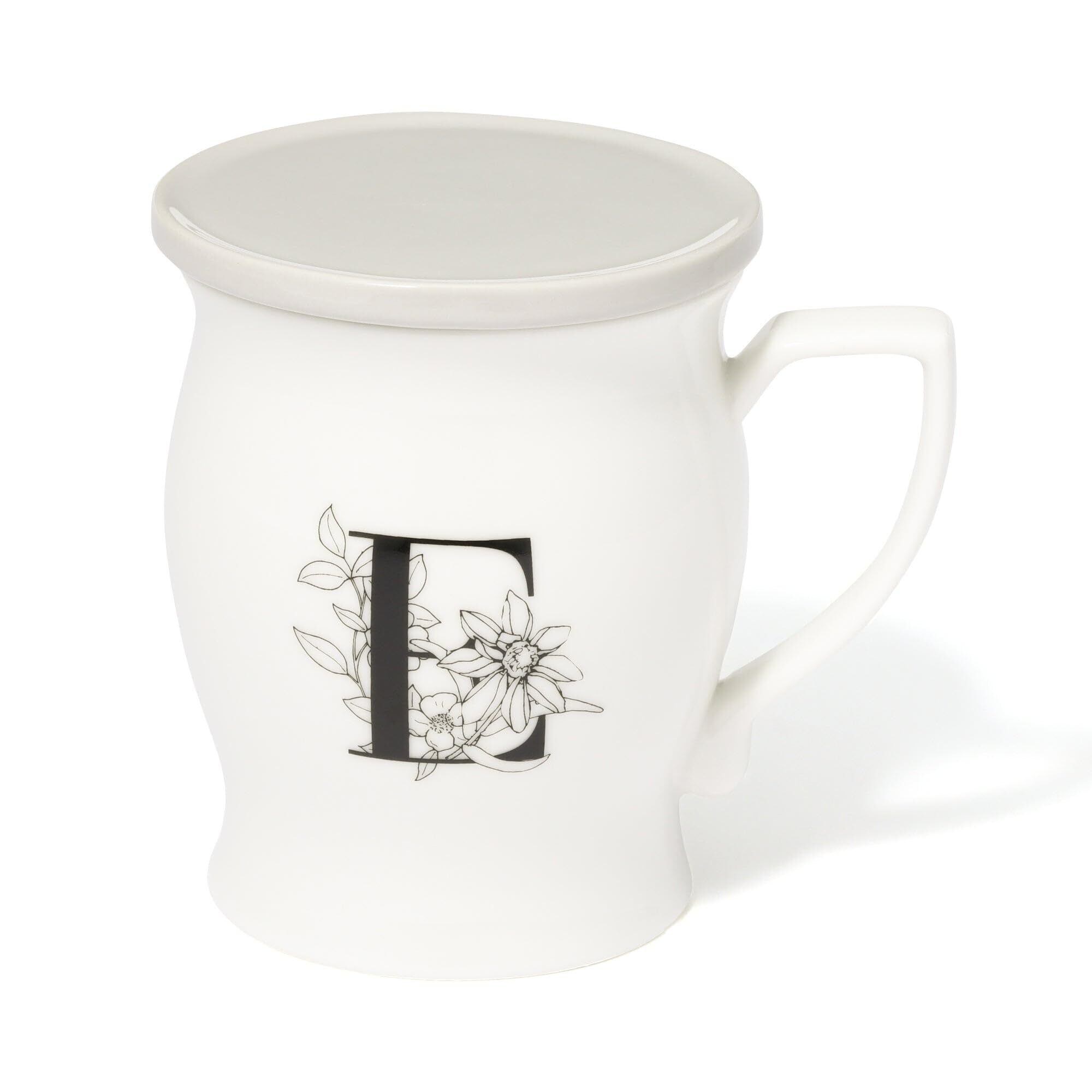 イニシャルとお花が描かれた、蓋付きのマグカップです。 使いやすい形のマグカップに、イニシャルで始まるお花をデザインしました。