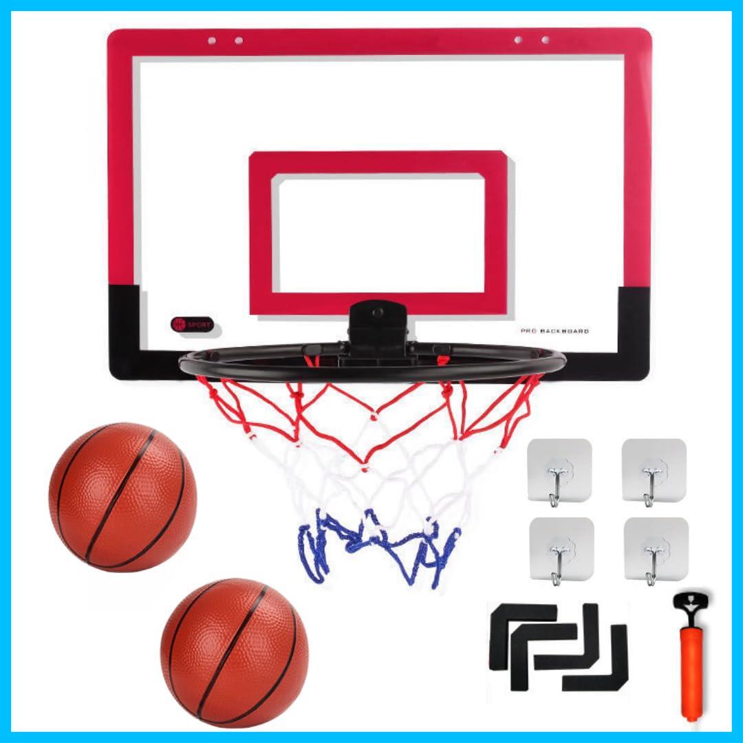 【商品詳細】サイズ:ゴール板40cm×26cm、リング内径21cm、ボール直径13cm、重量:540g、素材:プラスチック、パッケージ内容:バスケットゴール×1、ボール×2個、空気入れ、フック