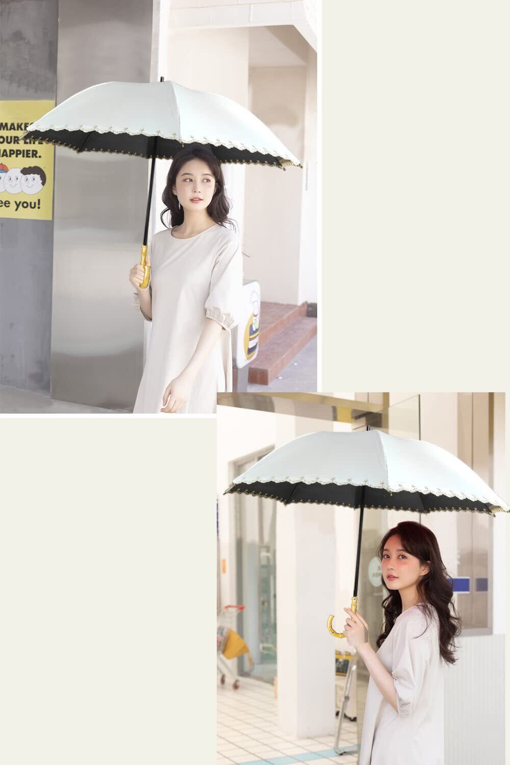 ✦【可愛くオシャレ・上品なデザイン・軽量日傘】長傘は気分が上がる配色・ホワイト、フラワー、刺繡など落ち着きのある色味で飽きのこないベーシックなデザイン、どんなシチュエーションやスタイルにも合わせやすい。まるくかわいいシルエットが魅力で、女性らしいエレガントな雰囲気を醸し出します。スリム型のショット傘なので、収納しやすく携帯便利です。誕生日、母の日、アウトドア、通勤、通学、贈り物、撮影会、結婚式、旅行、結婚記念日、就職祝い、暑中見舞い、還暦祝い、寿祝いなどのプレゼントとして最適。【商品詳細】サイズ:親骨:(約)50cm 使用時 : (約)直径90cm 材質: ポリエステル / バンブー(竹) / アルミ/重量: (約)/250g 遮光率:100% UV遮蔽率:100% UPF評価:UPF50+