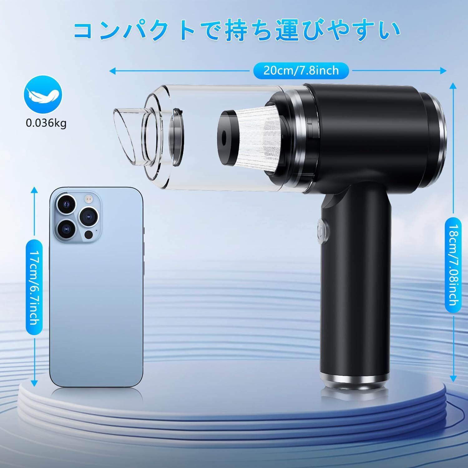 【軽量&持ち運びやすい】このミニハンディクリーナーは軽量設計で、本体の重さはわずか0.3kgです。コードレス設計により、自宅や車内でより柔軟に清掃が可能です。その携帯性により、旅行やアウトドア活動にも最適です。使用後は、車や家のどんな隙間にも簡単に収納でき、スペースを取りません。