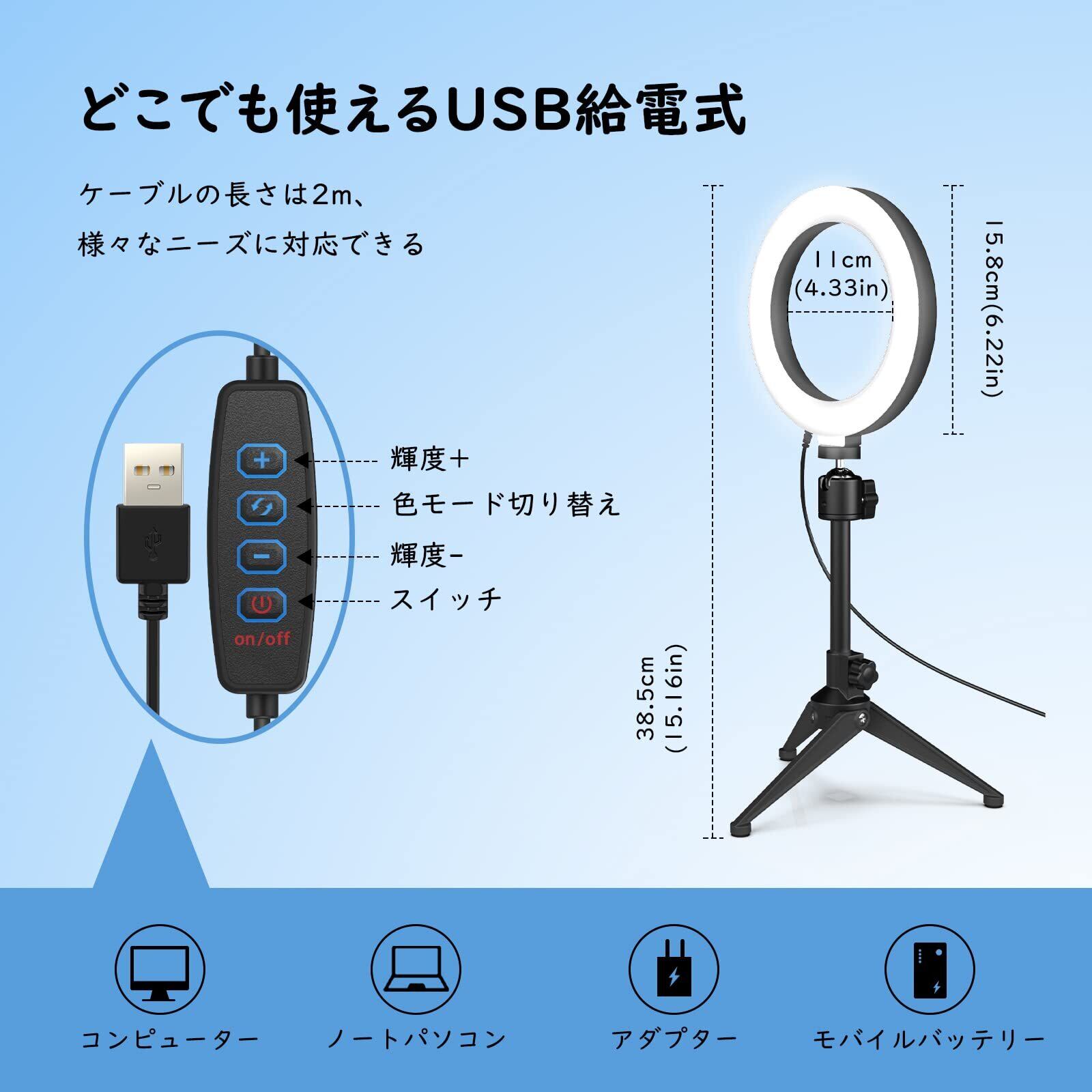 「エコなUSB給電式」 リングライトにUSBケーブルが付いており、パソコンやモバイルバッテリー又はスマホ充電器に繋いだら使用できます。乾電池の使用は不要で、環境にやさしい上、使用途中電源が切れる恐れはありません。電源・光量・色温度調整用のリモコンはケーブルと一体化され、紛失になることがなく、収納はとても便利です。
