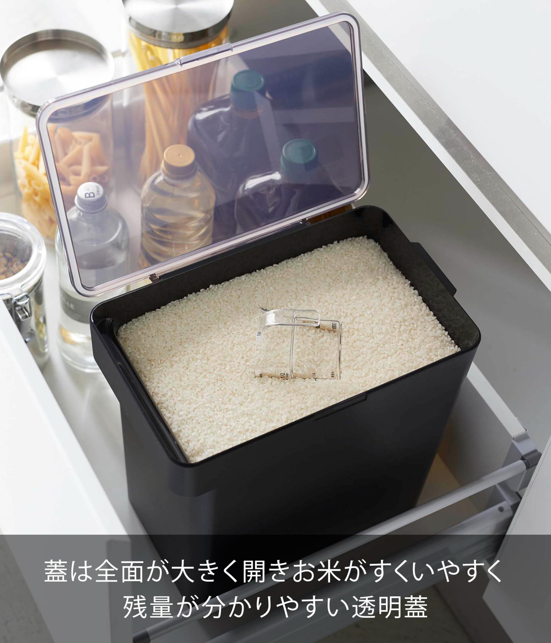 持ち手があるからお米の補充の際の移動も簡単! 炊飯器の横に置いておけば作業もスムーズ。