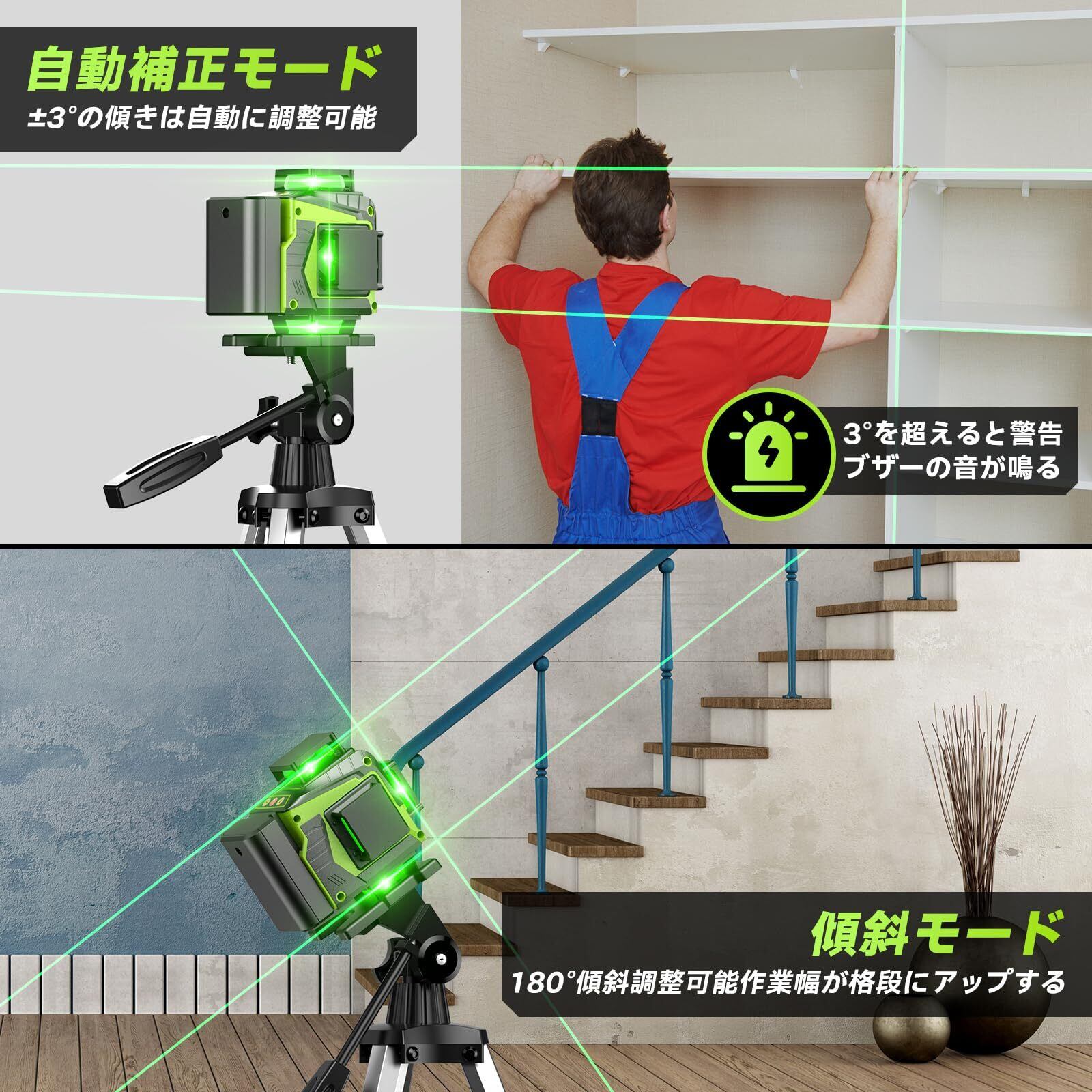 【豊かな付属品・品質】セットの内容:レーザー墨出し器本体x1、2400mAhのバッテリーx2、ミニ三脚360°回転ベースx1、充電器x1、収納バッグx1、日本語取扱説明書x1 弊社オリジナルの日本語取扱説明書あり、使用する前にぜひご覧ください。️本製品は1年間の品質を提供します。ご使用中にご不明な点がございましたら、お気軽にご連絡ください。弊社は2時間以内に返答いたして、お客様の問題を適切に解決するために最善を尽くします。方法:アカウントサービスの「アカウントサービス」→「」→「販売者」→「質問」からお気軽にください。