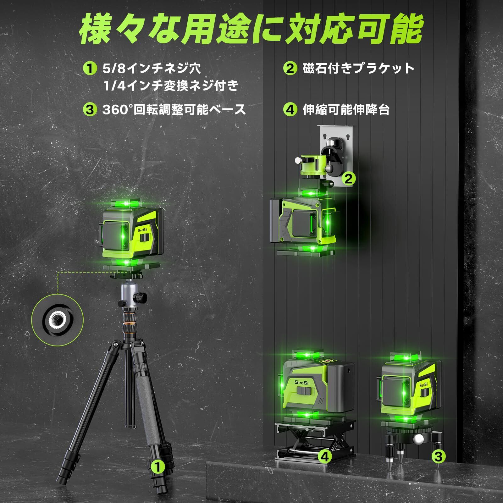 【2025年新登場】Seesii レーザー墨出し器 4x360° グリーンレーザー 水準器ツール 回転レーザー線 16ライン 緑色 小型 レーザー墨出し器 コンパクト DIY 自動補正 高輝度 高出力 高精度 軽天作業 受光器対応 リモコンコントロール 大容量バッテリー2個 日本語説明書 | Lulu