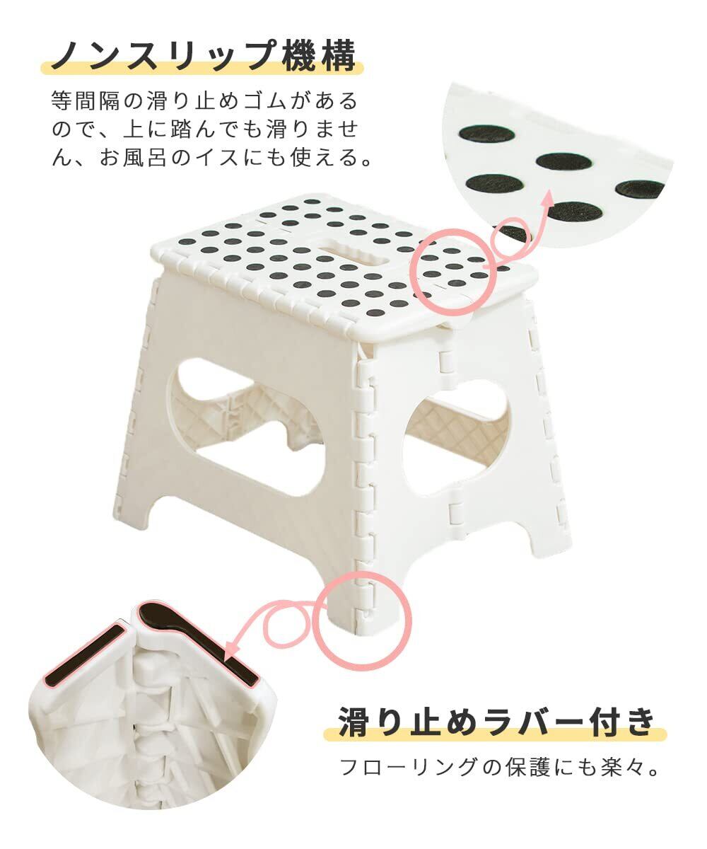 【滑り止め付き】天板と底に滑り止めゴムを配置しスツールから、ノンスリップ機能で安定性を保てる折りたたみ踏み台。
