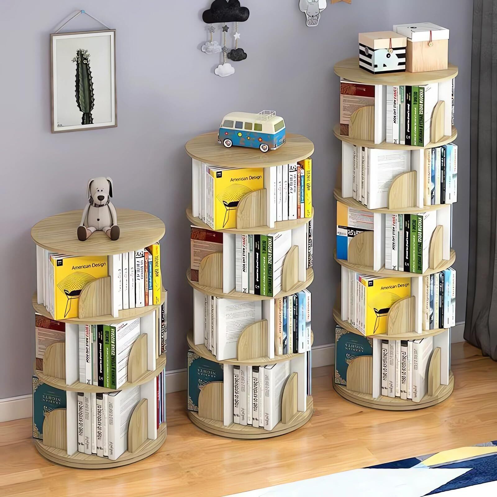 回転式本棚で簡単に整理:この回転本棚は360度自由に回転でき、どの角度からでも簡単にアクセスできます。軽く回すだけで、必要な本をすぐに見つけることができ、混乱を防ぎます。360°回転式本棚は本や展示物を美しくディスプレイするための理想的なアイテムです。厚みのある木板が高い安定性と耐久性を提供し、各段は木板で仕切られており、本の倒れを防ぎながら分類を簡単にします。