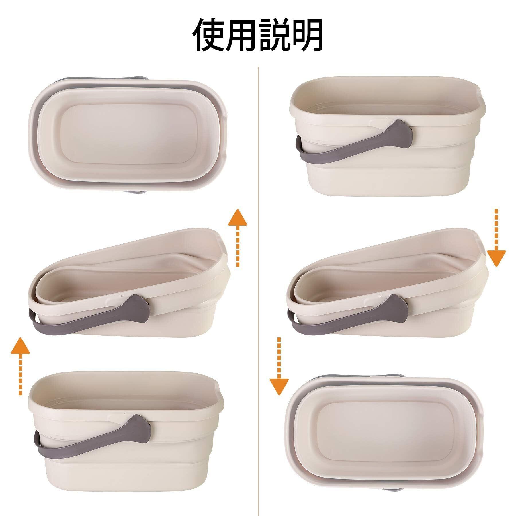 【折り畳みバケツ基本仕様】:折りたたみバケツ サイズ:①折りたたみ時:(約)長さ43×幅24×高さ7.5cm。 ②使用時:(約)長さ43×幅24×高さ21cm。折りたたみバケツ 重さ:(約)680g。折りたたみバケツ容量:(約)10リットル。折りたたみバケツ材質:PP+TPR。