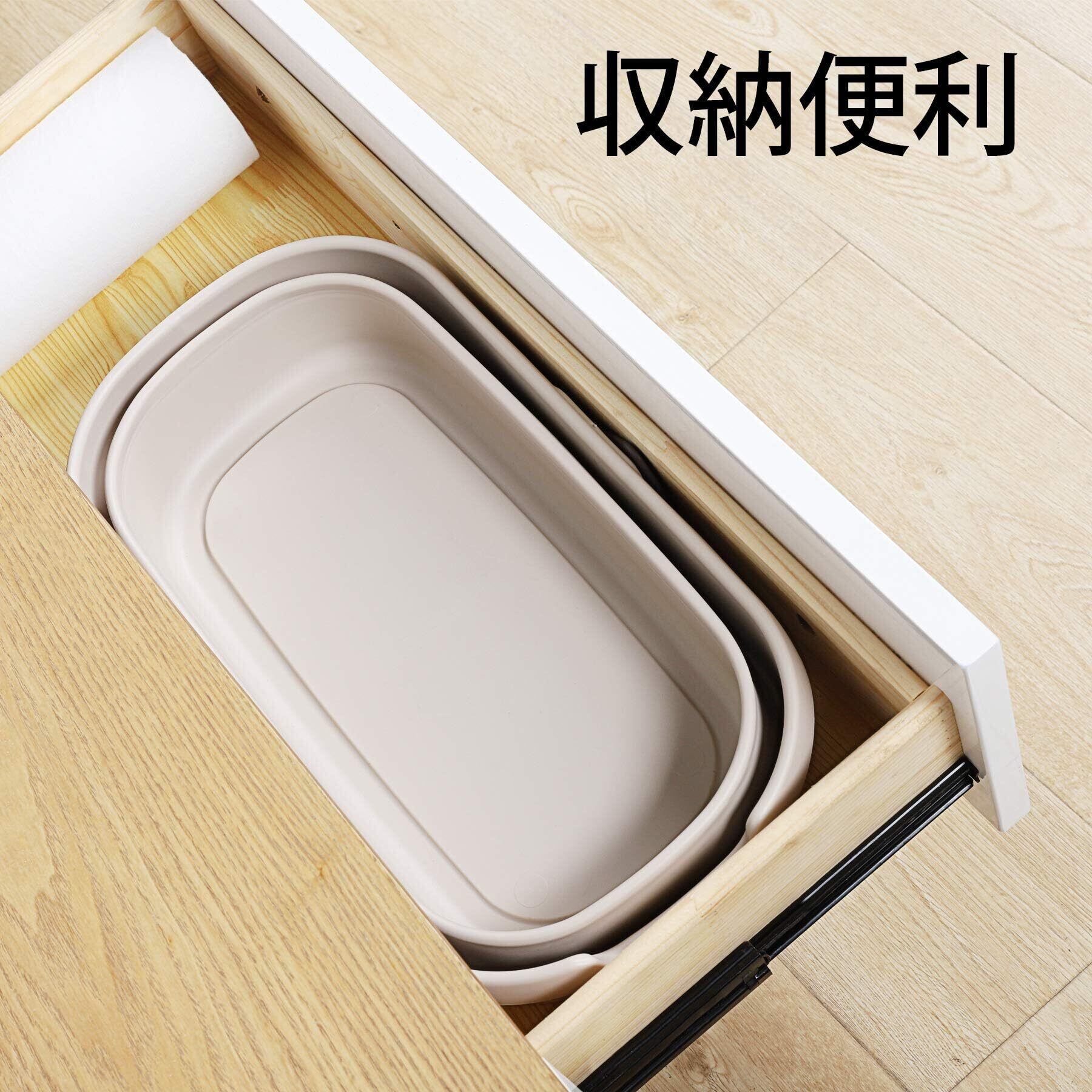 【折りたたみデザイン】:折りたたみバケツは、普通のバケツとは異なり、折り畳み可能なデザインです。使用後は、折りたたんでシンクの水きりに置いておいたり、隙間に収納したりして、とても省スペースです。