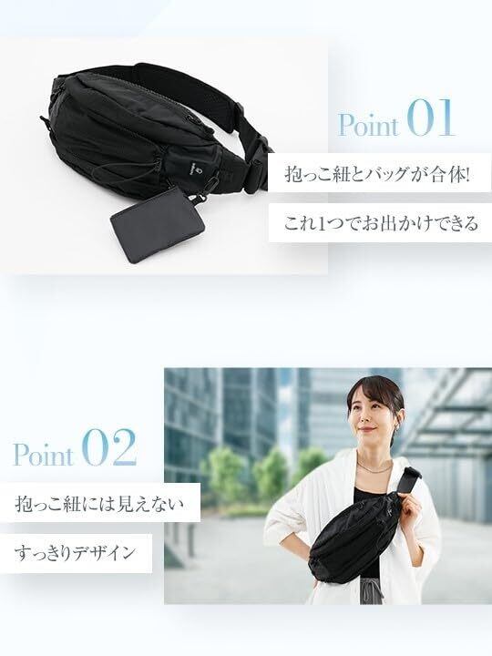 【1.抱っこ紐には見えないすっきりデザイン】スリムな縦型デザインだから、キレイ目コーデにも合わせやすい。【収納容量は3L】見た目に反してたっぷり入るから日常使いに大活躍。