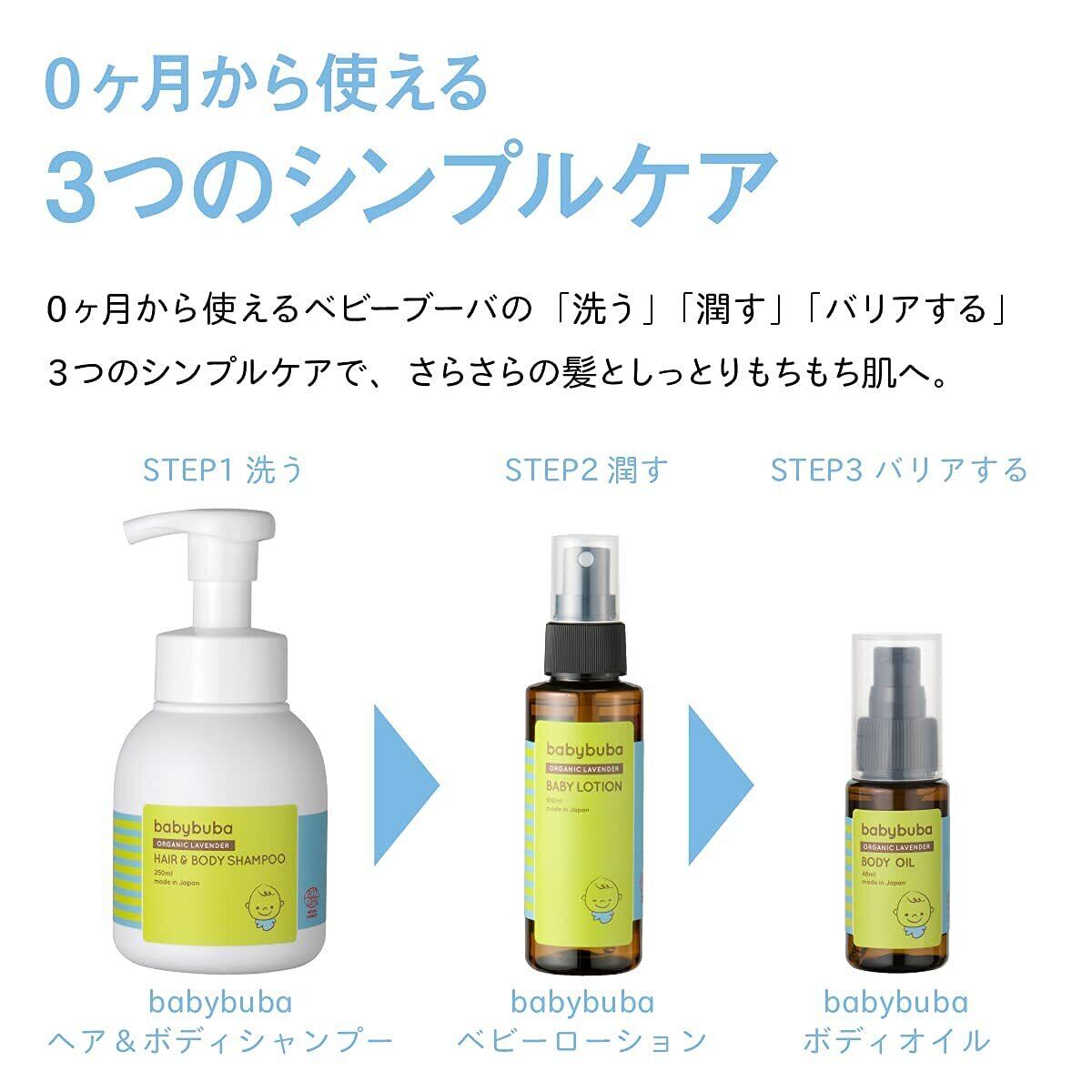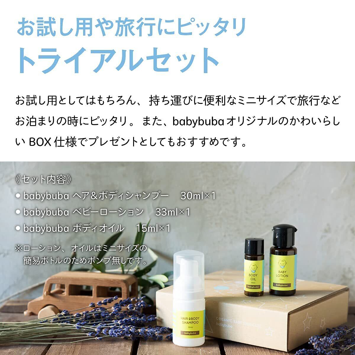 【内容】ヘア&ボディシャンプー30ml・ベビーローション33ml・ボディオイル15ml(babybubaオリジナルギフトボックス)