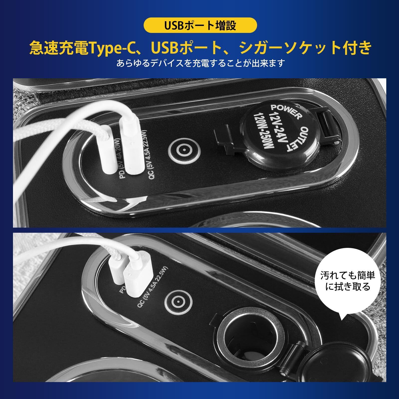 【LEDライト&充電便利】シエンタ 170系 コンソールボックス ブルーのLED灯が付き、夜車内が暗い時、小物を探すことに便利になります。POINT電源ボタンを押す回数でLEDライトの点灯部分を切り替えます。車内雰囲気が一瞬で高級感に変わります。スマホやタブレットの充電に対応するType-Cソケット、USBポートを内部に備えます。
