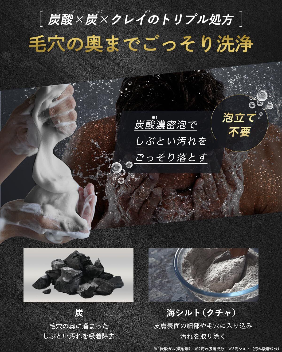 【弾力のある超濃密泡で肌の負担ゼロ】炭酸ガスによるクリーム泡で肌を強く擦ること無く、男性の頑固な古い角質や皮脂汚れをしっかりと洗浄し肌を徹底ケア。炭酸洗顔だから出来る清潔感と自信を引き出すプレミアムなメンズ洗顔。