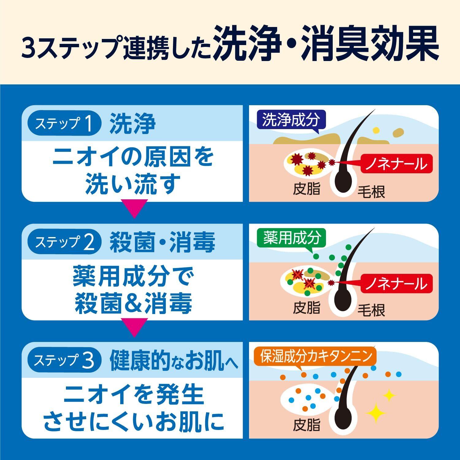 臭いの原因となる汗、皮脂などの汚れを豊かな泡で洗浄し、有効成分が臭いの原因である雑菌の繁殖を防ぎ、気になる臭いの発生を防ぎます。