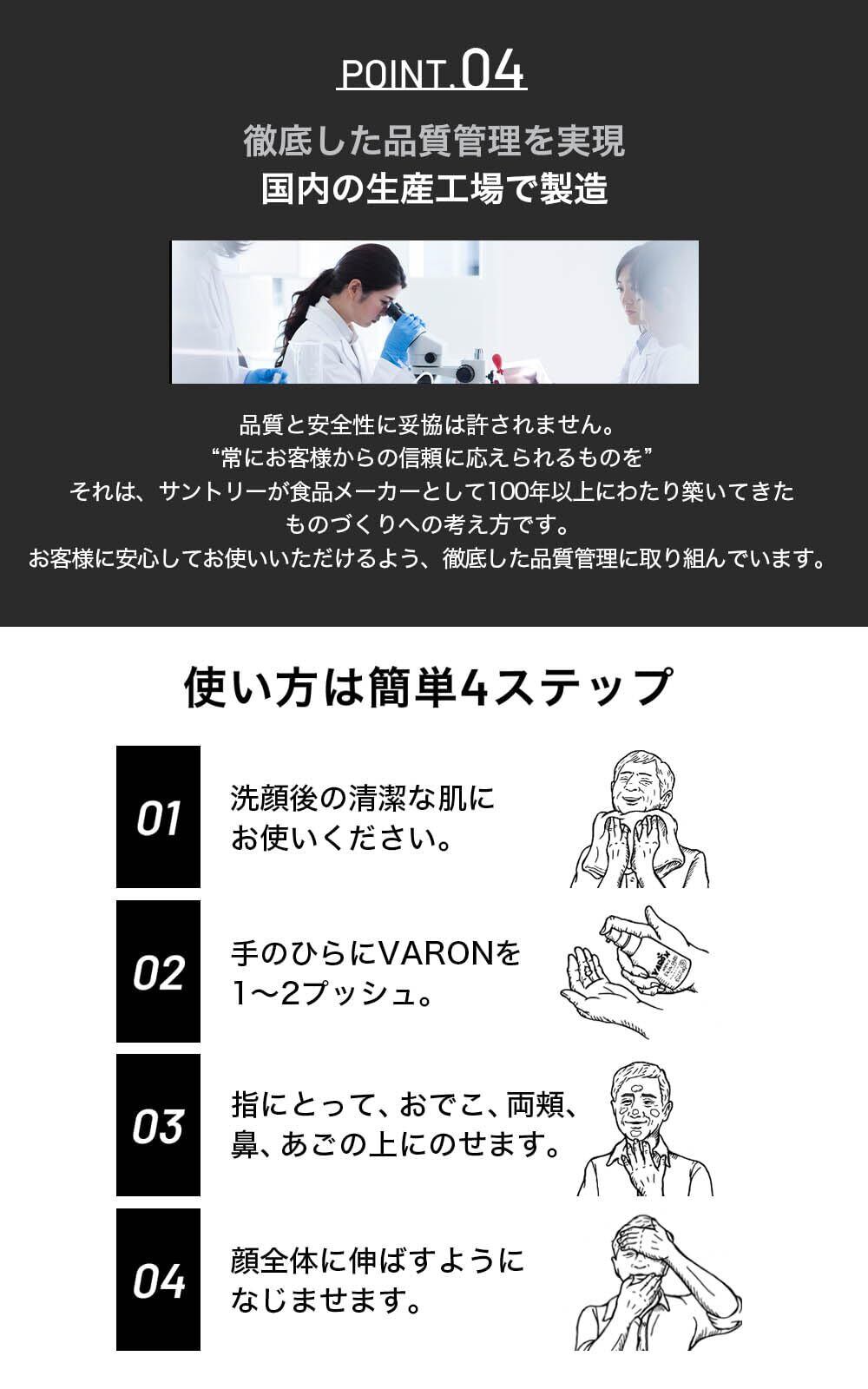 【おすすめする理由3:紳士の大人肌へ導く独自の3層時間差浸透※技術を採用】サントリーは独自の技術「WOW*エマルジョン」で、安定させることが難しかったWOW*(水相・油相・水相)構造を実用化しました。VARONは、他の一般的なオールインワンとは違う、WOW構造を活かした3層時間差浸透※技術で化粧水成分、美容液成分、クリーム成分が役割順に肌へ浸透していくため、1本のお手入れだけで、しっとりとしたすべすべ肌へ導きます。※独自の3層構造により成分を3段階で角層に届けること