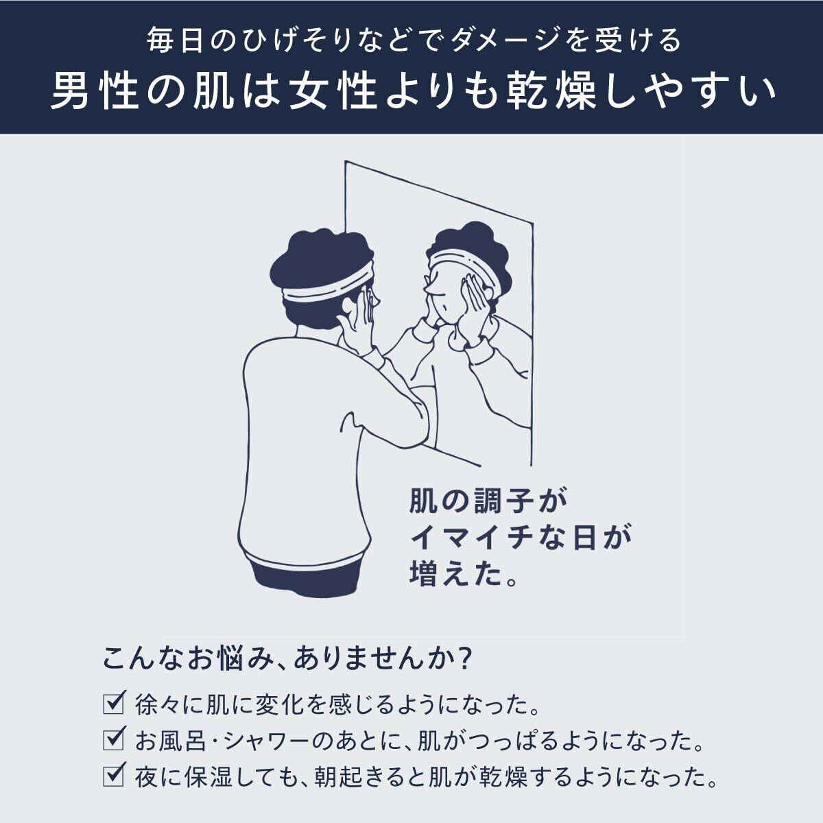 【男性特有の乾燥原因に着目】ひげ剃りなどの男性特有の生活習慣で加速する、乾燥原因「うるおい流出ループ」に着目。セラミド(*1)を補う×角層を整える(*2)ダブルのアプローチを採用。肌をうるおいで満たし、健やかで快適な肌へ誘います。(*1) 整肌成分:ヒト型セラミド(セラミドNP、セラミドAP)、ヒト型アシルセラミド(セラミドEOP)のこと。(*2) 「角層を整える」は、肌を整えるという意味です。