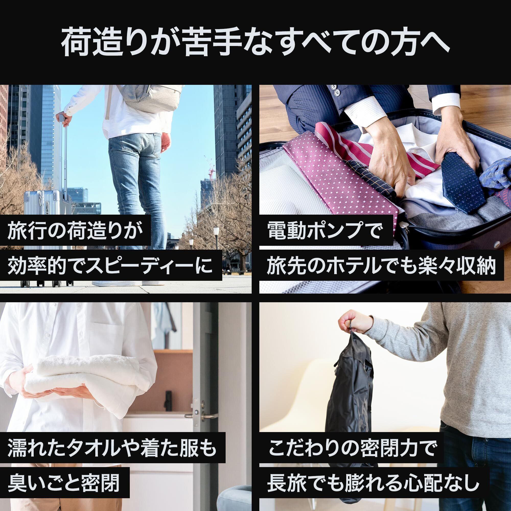 【電動ポンプなら約10秒で圧縮】圧縮トラベルバッグは専用の電動ポンプを使うと、約10秒で高速圧縮できます。電動ポンプをノズルにはめて、スイッチを押すだけ。手押しなら、約30秒ほどで圧縮できます。