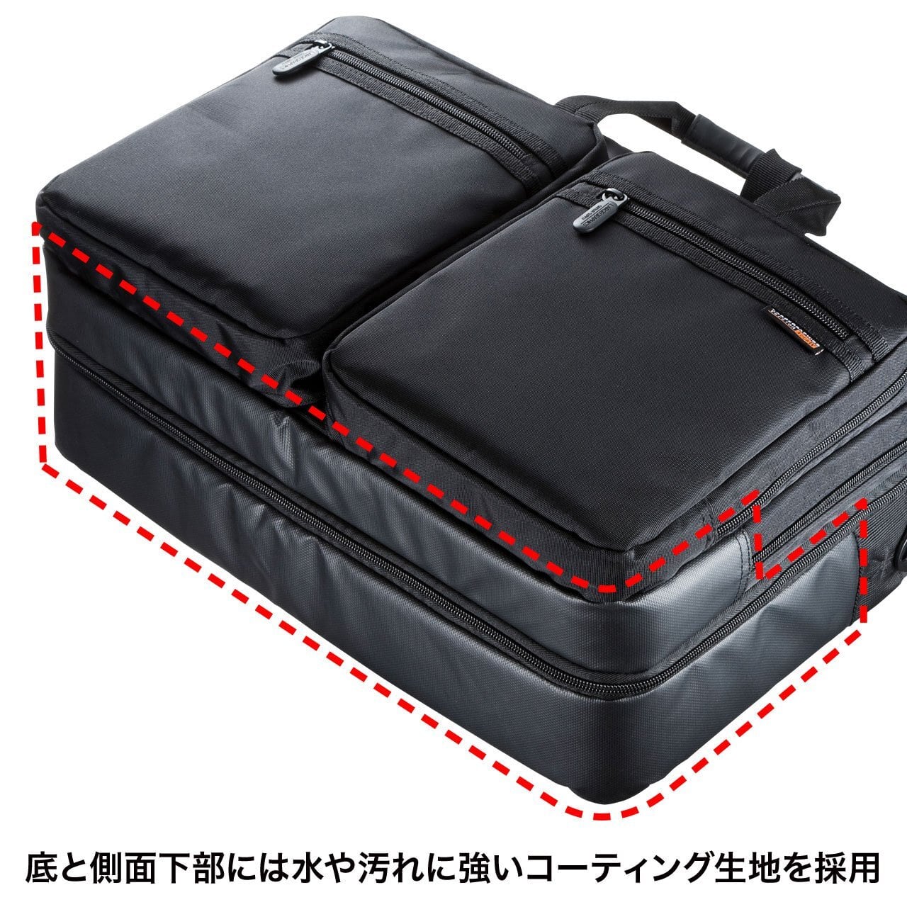底と側面には水や汚れに強いコーティング生地を採用しています。