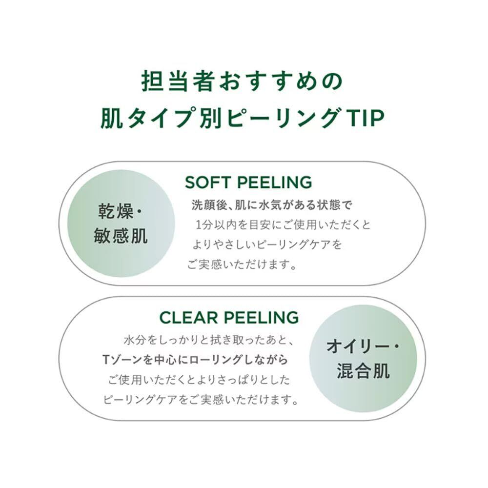 おすすめの肌タイプ別ピーリングTIP / 1. soft peeling:洗顔後、肌に水分がある状態で1分以内を目安にご使用いただくとより優しくピーリングケアをご実感いただけます。2. clear peeling : 水分をしっかりと拭き取ったあと、Tゾーンを中心にローリングしながらご使用いただくとよりさっぱりとしたピーリングケアをご実感いただけます。