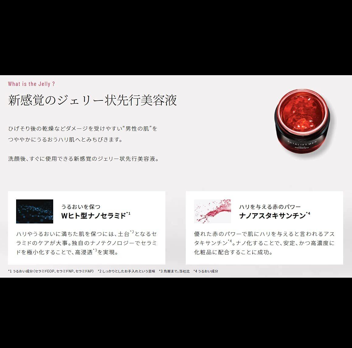 【健康的な肌へ!最初のアドバンテージ。“赤のジェリー”(※1)】うるおいを保持する肌本来の力に着目。独自のナノサイエンスで極小化した保湿成分「Wヒト型ナノセラミド(※2)」・「ナノアスタキサンチン(※3)」が角層のすみずみに浸透。【注釈】※1 メンズスキンケアでジェリー状先行美容液を使用すること。 ※2 うるおい成分 (セラミドEOP、セラミドNP、セラミドAP) *3 うるおい成分 (ヘマトコッカスプルビアリス油)