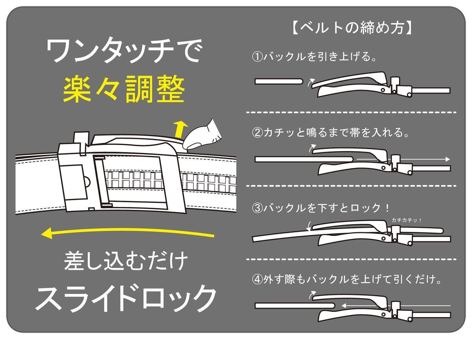 帯を差しこむだけでカチッと止まり、バックルを引き上げるだけでスルッと抜ける着脱が簡単なスライドロックベルト。 バックルにある突起がバックルの上げ下げで動き、ベルト帯に付けられた段差のあるレールで止まる仕組みになっています。 通常のピンベルトの場合は約25mm間隔での調整ですが、こちらは6mm間隔で微調整できます。 通常座っているときなどは両手でお腹をへこませながら緩める必要がありますが、こちらは片手で簡単に緩めることができます。 約18cmの調整が可能ですが、大きい場合はご自身で帯をカットして調整していただくことも可能です。 まるでピンバックルのベルトを着けているようなデザインで、スーツからジーンズまで幅広いコーディネートでご使用いただけます。 やや丸みのあるバックルはブラックニッケル仕上げで、落ち着いた雰囲気に仕上がっています。