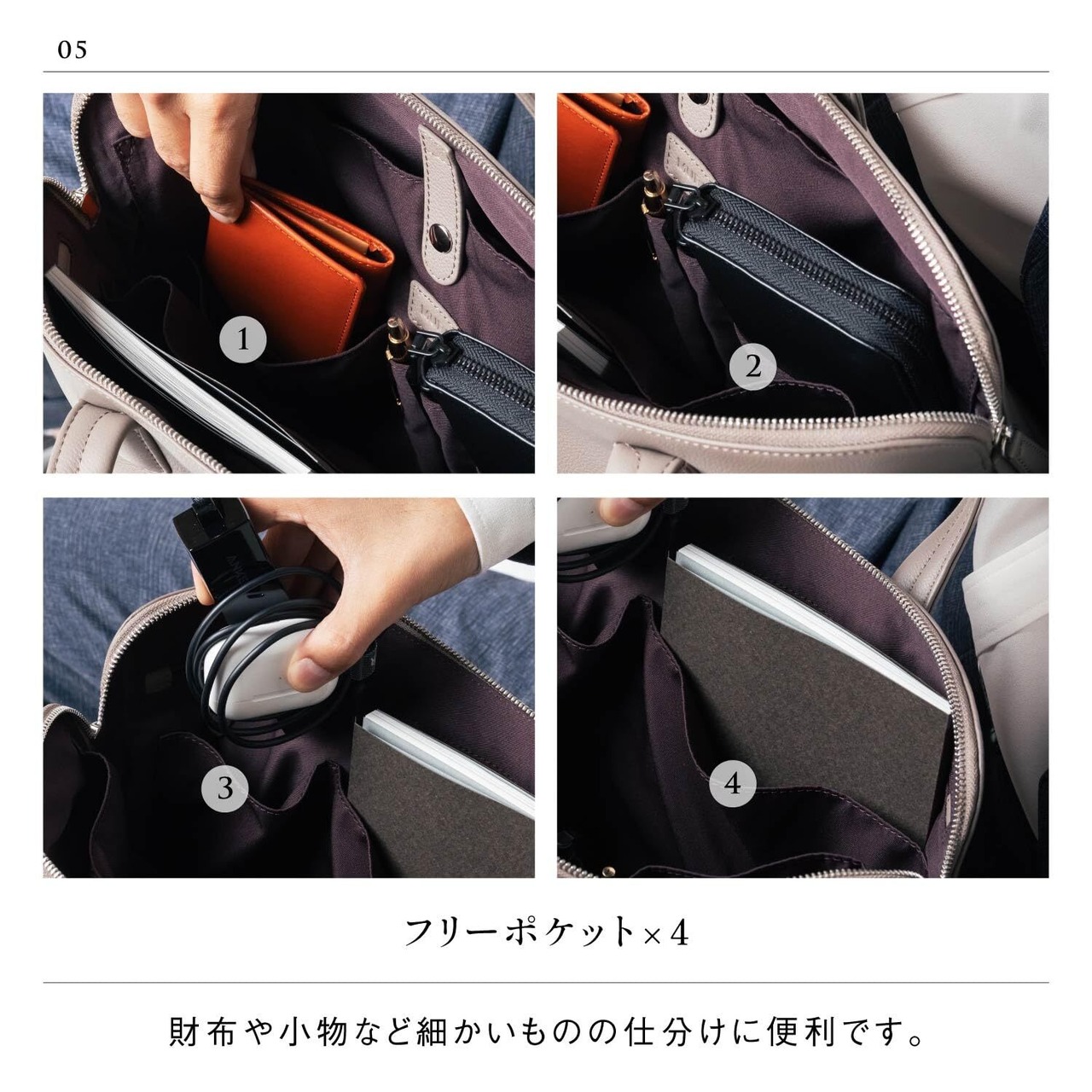 【仕分けできる収納ポケット】大事な財布やノートPCなどしっかり分けて収納可能。 メイン収納1箇所、スナップボタン付ポケット1箇所、ファスナーポケット1箇所、ペンポケット2箇所。 さらに、フリーポケットは4箇所あり財布や小物など細かいものの仕分けに便利です。【自立可能な底鋲】底面には自立可能な5つの底鋲を備え、大事なバッグに汚れが付くのを防ぎます。 金具にもこだわりがあり、取れにくく錆びにくくしっかりしております。