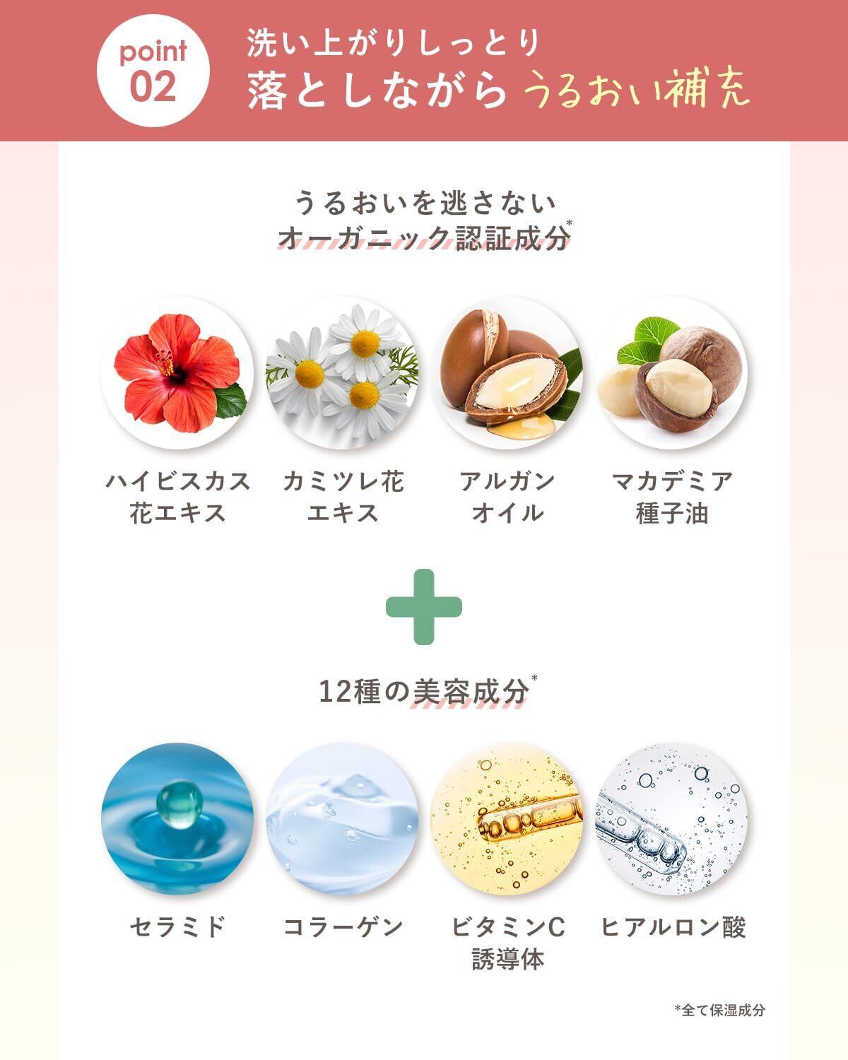 【 うるおい補充 】汚れをしっかり落としながら、洗い上がりしっとり!オーガニックな保湿成分*¹や12種の美容成分*²たっぷりで潤いを逃がしません。(*¹ハイビスカス花エキス・カミツレ花エキス・アルガンオイル・マカデミア種子油 *²セラミド・コラーゲン・ビタミンC誘導体・ヒアルロン酸:全て保湿成分)