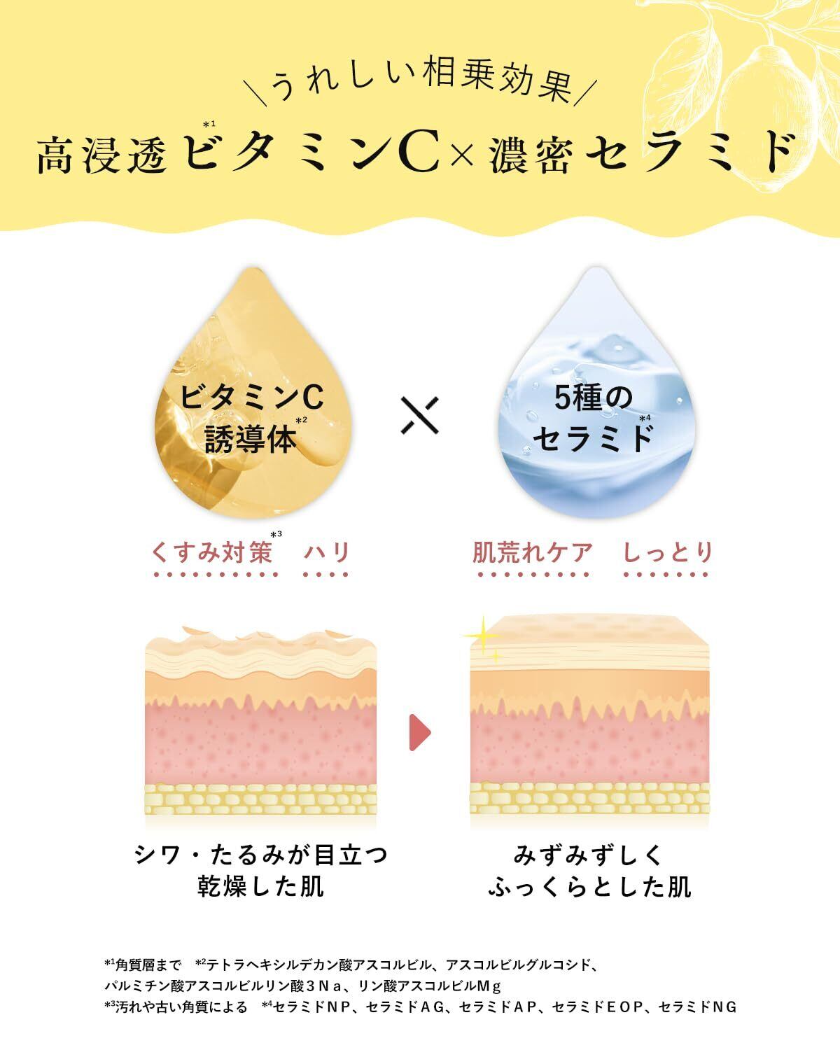 【 ビタミンC×セラミド 】ただ クレンジング するだけじゃない!「高浸透*¹ ビタミンC」 と 「濃密 セラミド」 の相乗効果が、「くすみ対策*²」 と 「肌荒れケア」 をし、みずみずしくふっくらとした肌へ導きます。(*¹角質層まで *²古い汚れや角質による)