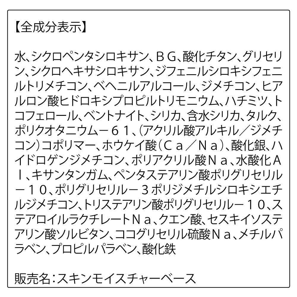 【全成分表示】水、シクロペンタシロキサン、BG、酸化チタン、グリセリン、シクロヘキサシロキサン、ジフェニルシロキシフェニルトリメチコン、ベヘニルアルコール、ジメチコン、ヒアルロン酸ヒドロキシプロピルトリモニウム、ハチミツ、トコフェロール、ベントナイト、シリカ、含水シリカ、タルク、ポリクオタニウム-61、(アクリル酸アルキル/ジメチコン)コポリマー、ホウケイ酸(Ca/Na)、酸化銀、ハイドロゲンジメチコン、ポリアクリル酸Na、水酸化Al、キサンタンガム、ペンタステアリン酸ポリグリセリル-10、ポリグリセリル-3ポリジメチルシロキシエチルジメチコン、トリステアリン酸ポリグリセリル-10、ステアロイルラクチレートNa、クエン酸、セスキイソステアリン酸ソルビタン、ココグリセリル硫酸Na、メチルパラベン、プロピルパラベン、酸化鉄