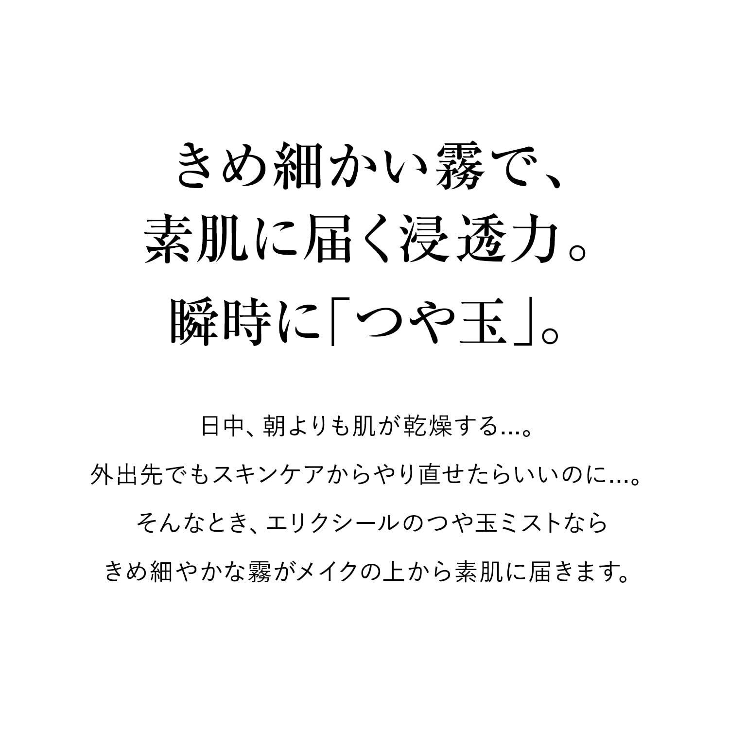 メイクの上から素肌に届く、瞬時に「つや玉」、エイジングケア*。きめ細かいミストが、メイクの上からもたっぷりのうるおいとなめらかで均一なハリを与え、瞬時に「つや玉」が輝く肌へ。 美容水層と美容オイル層が混ざり合い、メイクを崩さず肌のすみずみまでうるおいで満たします。 明るくリフレッシュした気分を演出する、みずみずしいフローラルの香り。 *年齢に応じたうるおいケア