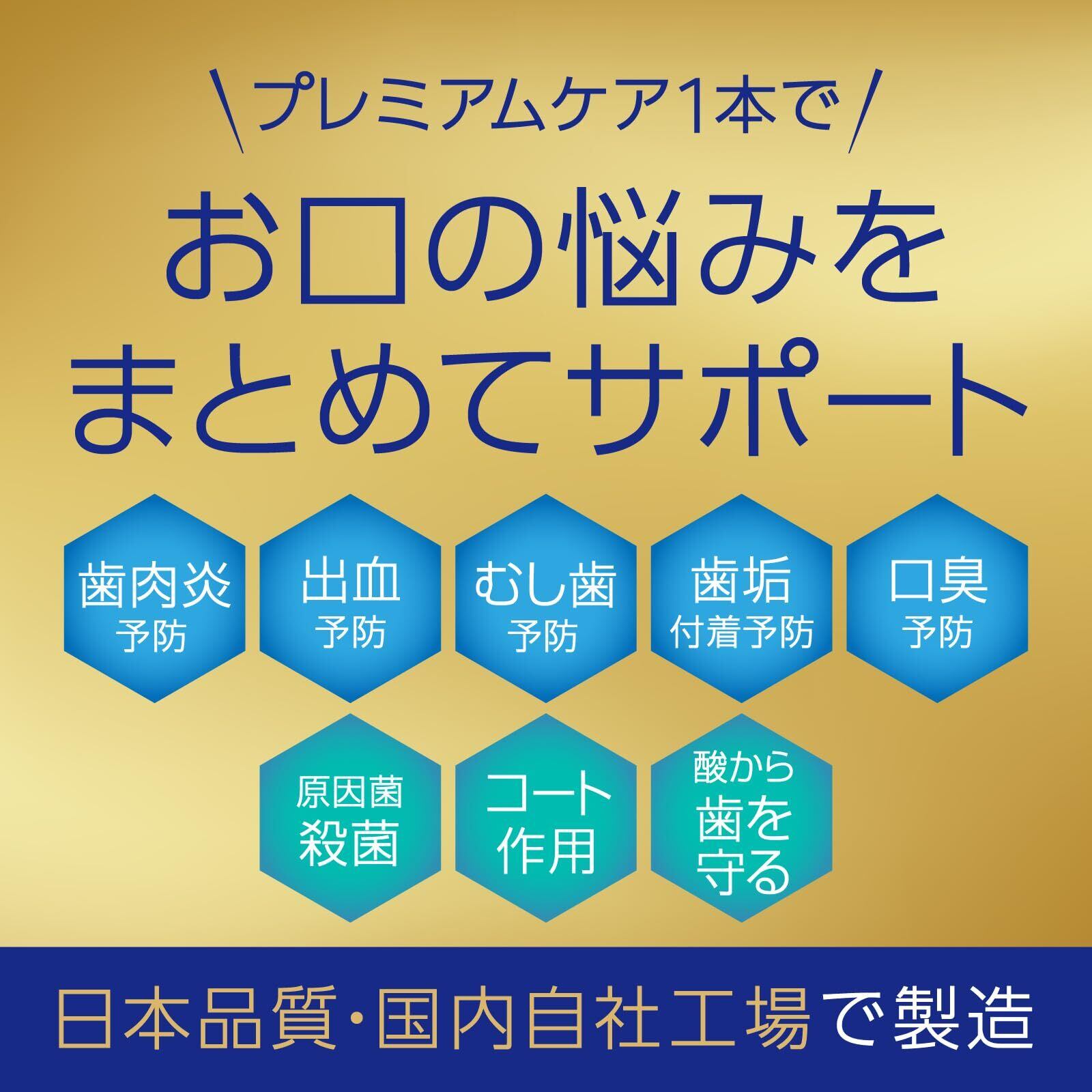 ●湿潤剤:濃グリセリン●溶剤:エタノール●香味剤:香料(プレミアムミントタイプ)、キシリット、スクラロース●pH調整剤:炭酸水素Na、水酸化Na●可溶剤:POEセチルエーテル●洗浄剤:アルキルカルボキシメチルヒドロキシエチルイミダゾリニウムベタイン、EDTA-2Na●歯のコーティング剤:白色セラック●保存剤:フェノキシエタノール、パラベン●薬用成分:セチルピリジニウム塩化物水和物(CPC)、トラネキサム酸(TXA)、グリチルリチン酸ジカリウム(GK2)●着色剤:黄色4号