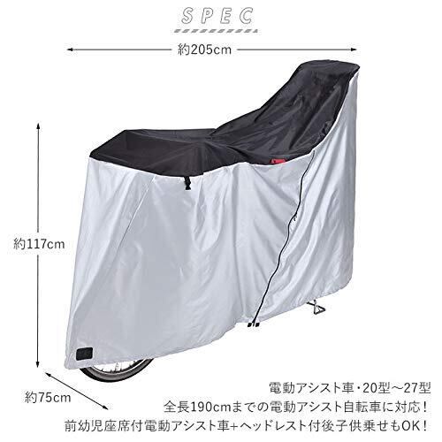 ・電動アシスト車・20型~27型、全長190cmまでの電動アシスト車に対応。前幼児座席付き電動アシスト車+ヘッドレスト付き後ろ子ども乗せシートにもすっぽりと被せられる!