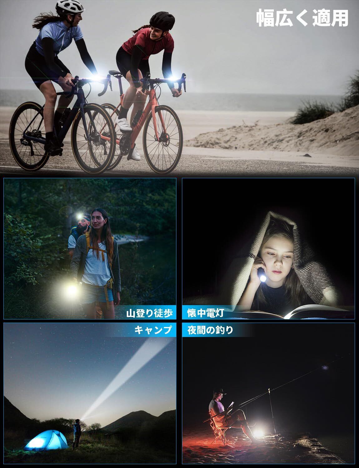 【実用性&汎用性抜群】製品の安全性能は高く、多重保護設計。自転車 ライトや非常灯としても使えるコンパクトなライトです。万が一の災害時にも頼りになります。軽量高强度プラスチックで、軽さを求めるロードバイクに向けます。キャンプ、ハイキング、山登り、サイクリング、懐中電灯、犬散歩、夜釣等、いろんなシーンにご利用可能です。