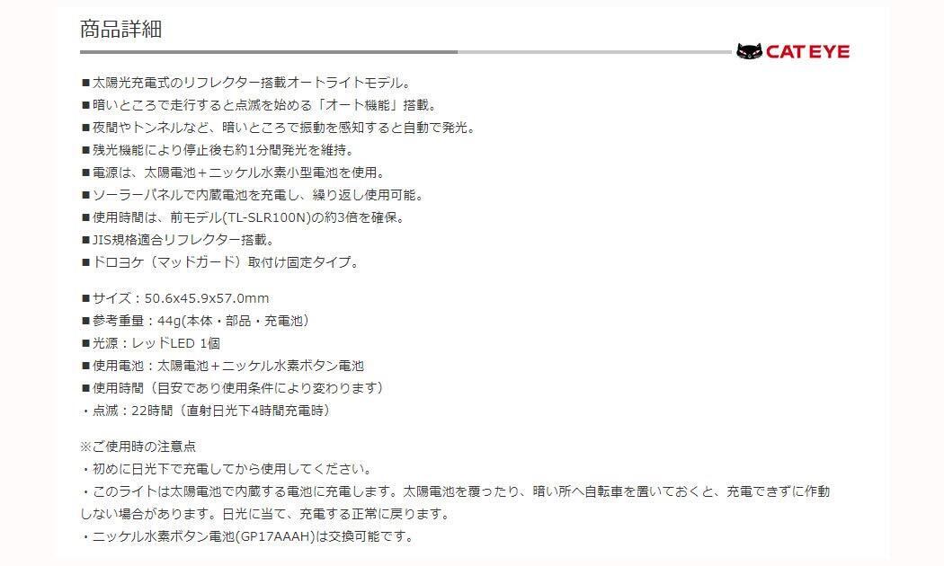キャットアイ(CAT EYE) テールライト 赤 ソーラー充電 TL-SLR120 ライト 自転車