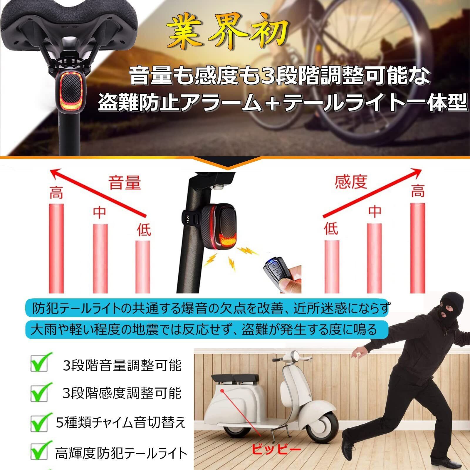 【感度も音量も同時に調整可能な防犯テールライト登場】感度や音量は3段階から自由に調整可能となりますので、市販上の防犯テールライトの共通する爆音という欠点を改善し、近所迷惑にならない同時に、大雨や軽い程度の地震では反応せず、盗難が発生する際に鳴ることができます。【知能的な盗難アラーム&テールライト兼用】単なるテールライトだけではなく、バイクや自転車のセキュリティアラームとしても使いやすいです。生産工場は8000回の感度実験を行い、特定な感度を設置完了したため、万が一盗難が発生する時、テールライトは高速フレッシュするとともに、十分な105~120dbの音が鳴り、アラームしてくれますので、泥棒・侵入者に効果的に撃退できます。(別途で盗難アラームを購入する必要が無し)